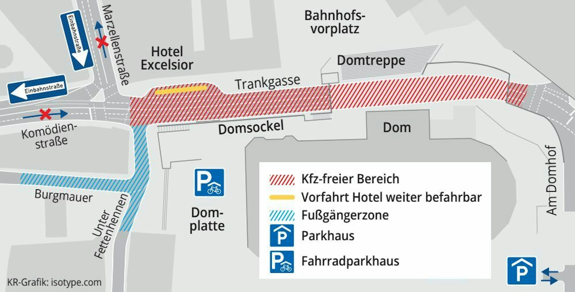 Im autofreien Szenario soll die Tiefgarage unter der Domplatte von der Trankgasse aus nur noch mit Fahrrädern zu befahren sein, in diesem Teil dürfen nur Räder parken. Für Autos bleiben Zu- und Ausfahrt über den Kurt-Hackenberg-Platz. Zusätzlich sollen Komödien- und Marzellenstraße zur Einbahnstraße werden, das reduziert laut Verwaltung die Autofahrten um 59,1 und 32,5 Prozent. Die Straße zum Kardinal-Höffner-Platz samt Zugang zur Domplatte wird Fußgängerzone, es ist die einzige Neuerung, die für alle vier Varianten gelten soll.