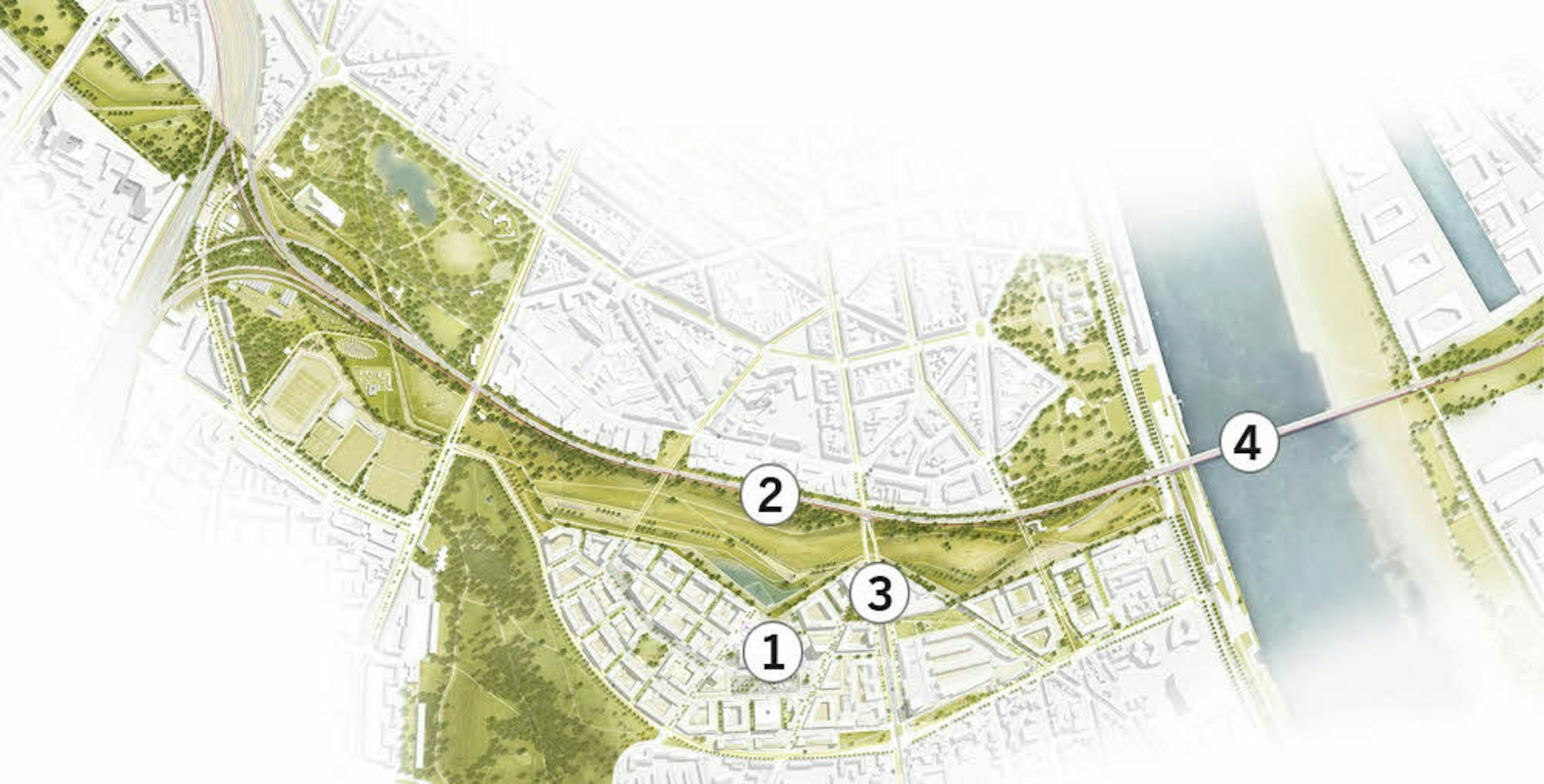 Die „Parkstadt Süd“: Die Bahnstrecke (2), die über die Südbrücke (4) führt. Die Großmarkt-Halle (1) soll neu genutzt werden, an der Bonner Straße sollen drei Hochhäuser (3) entstehen.