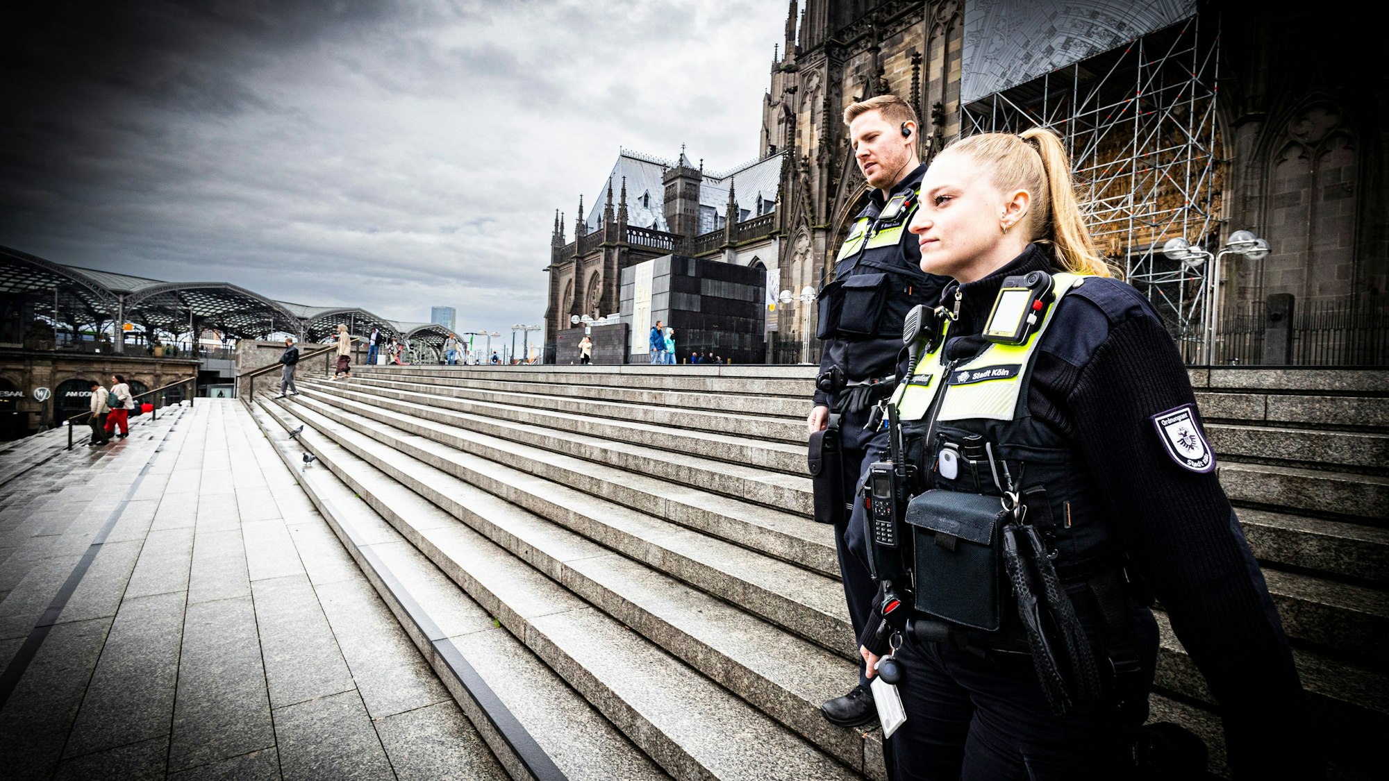 An einem verregneten Montagnachmittag kann die Rundschau zwei Ordnungskräfte der sogenannten „Domstreife“ begleiten. Ihr Zuständigkeitsbereich verläuft rund um den Dom, also vom Breslauer Platz über den Hauptbahnhof, die Rheingärten und die historische Altstadt bis zum Neumarkt. 22 Ordnungskräfte umfasst die „Domstreife“. Doch schnell wird klar: Wetter und Tageszeit sprechen nicht gerade dafür, dass Johanna Lobenstein und Felix Günther (Vornamen redaktionell geändert) heute Cannabis-Verstöße feststellen werden.