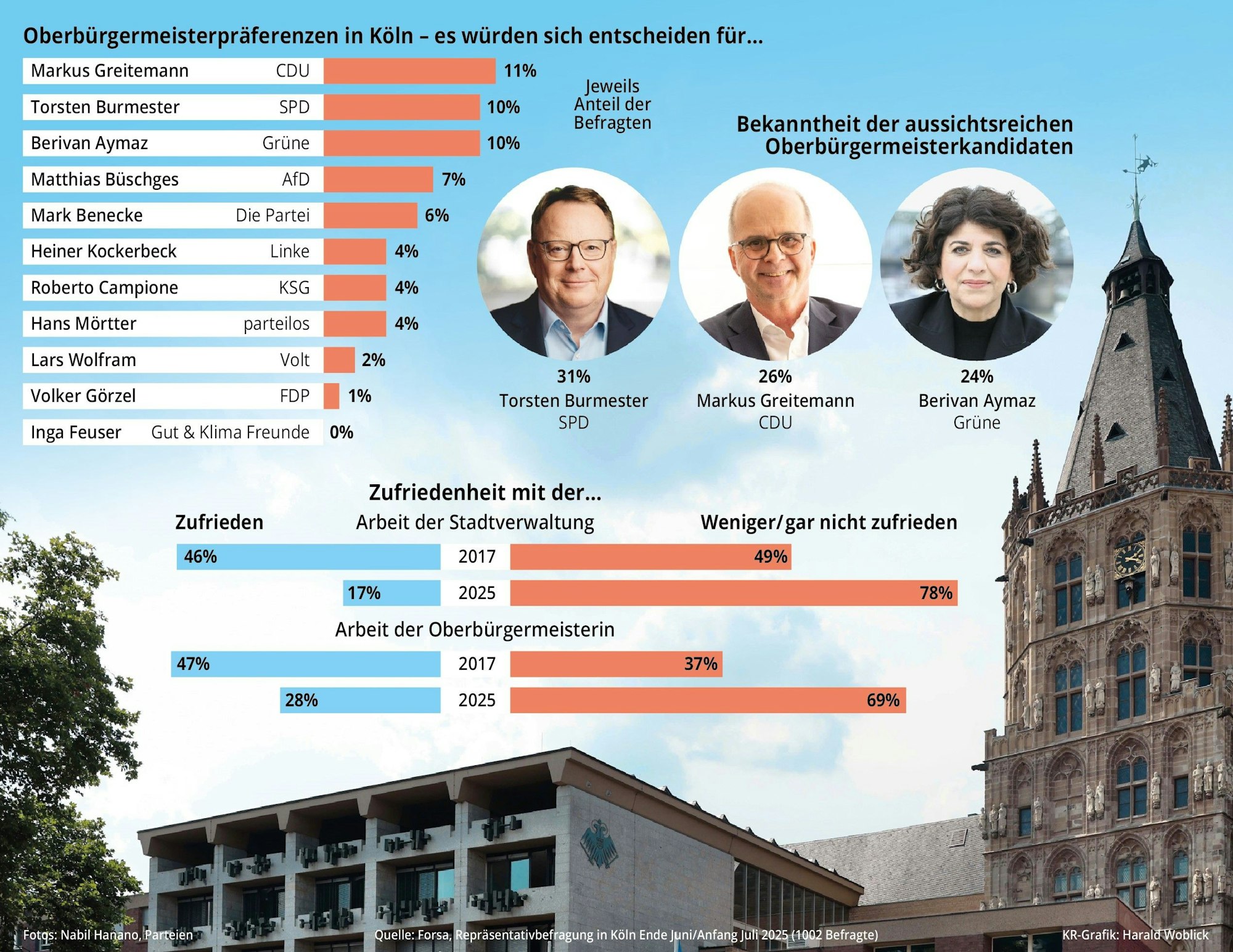 Die Infografik zeigt Präferenzen der Kölner bei der Kommunalwahl 2025 laut Forsa-Umfrage sowie ihre Ansichten über die Arbeit der Stadtspitze.