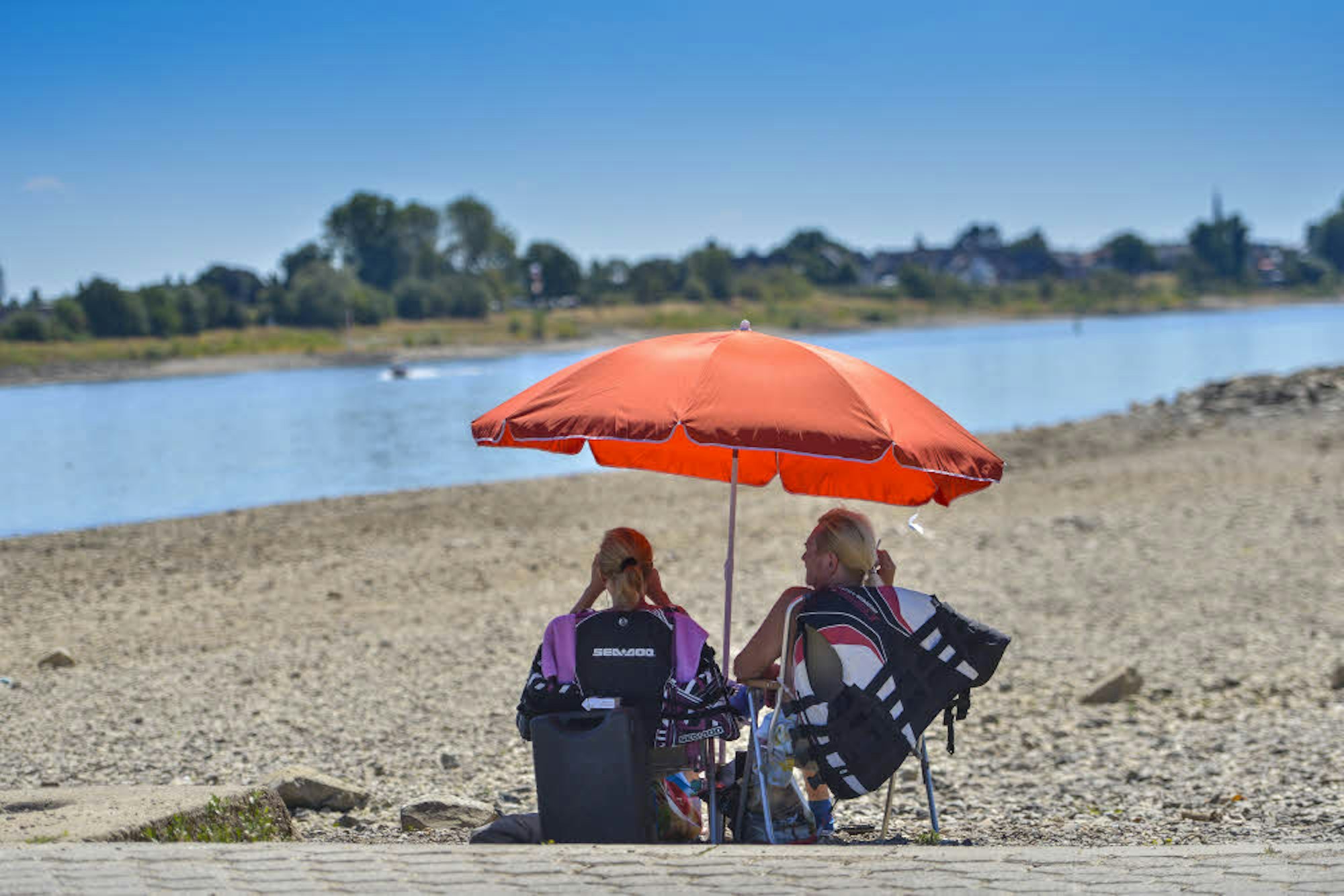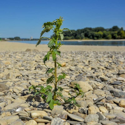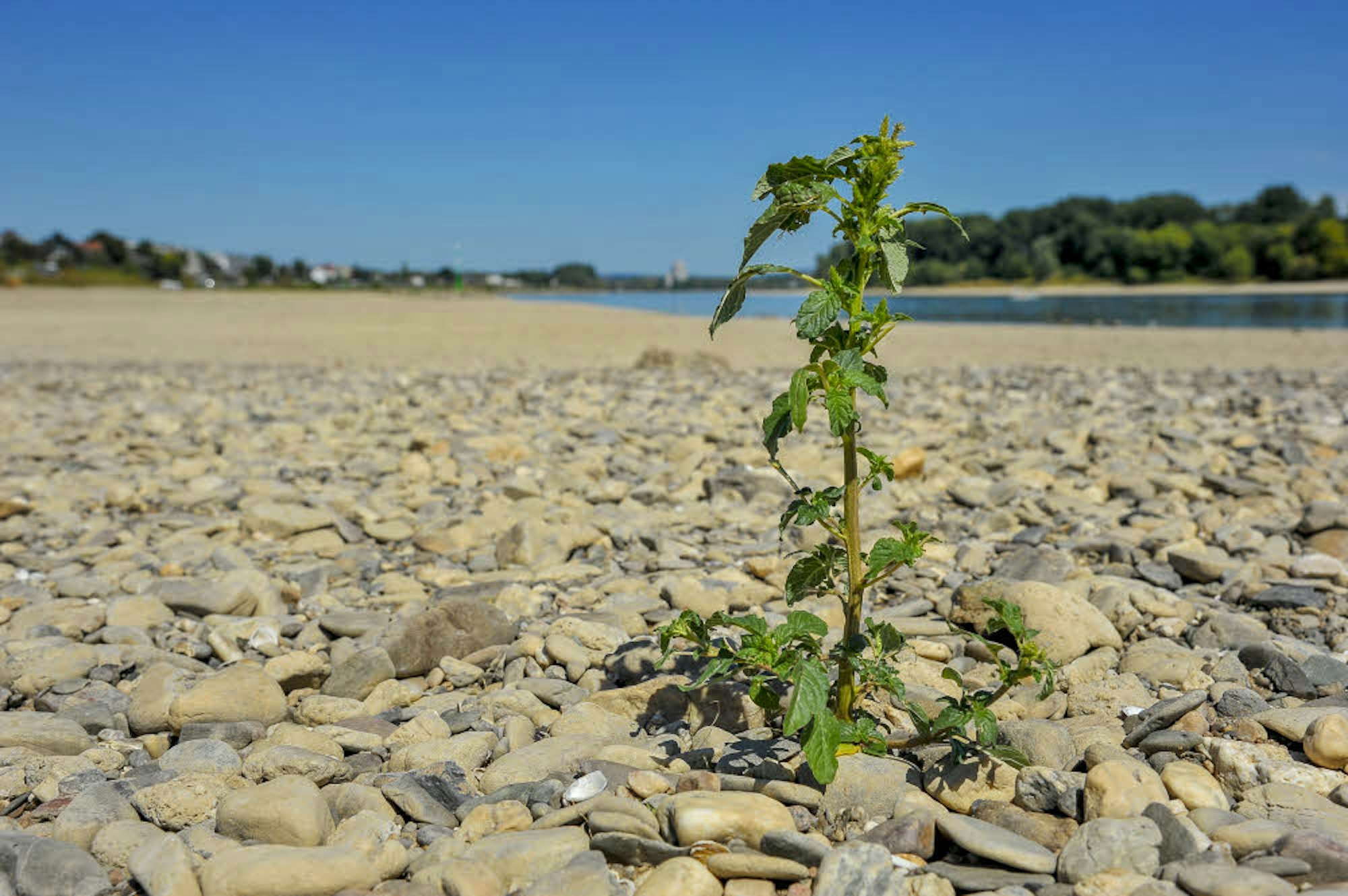 Das Flussbett des Rheins liegt teils offen zutage und erinnert an einen Salzsee.