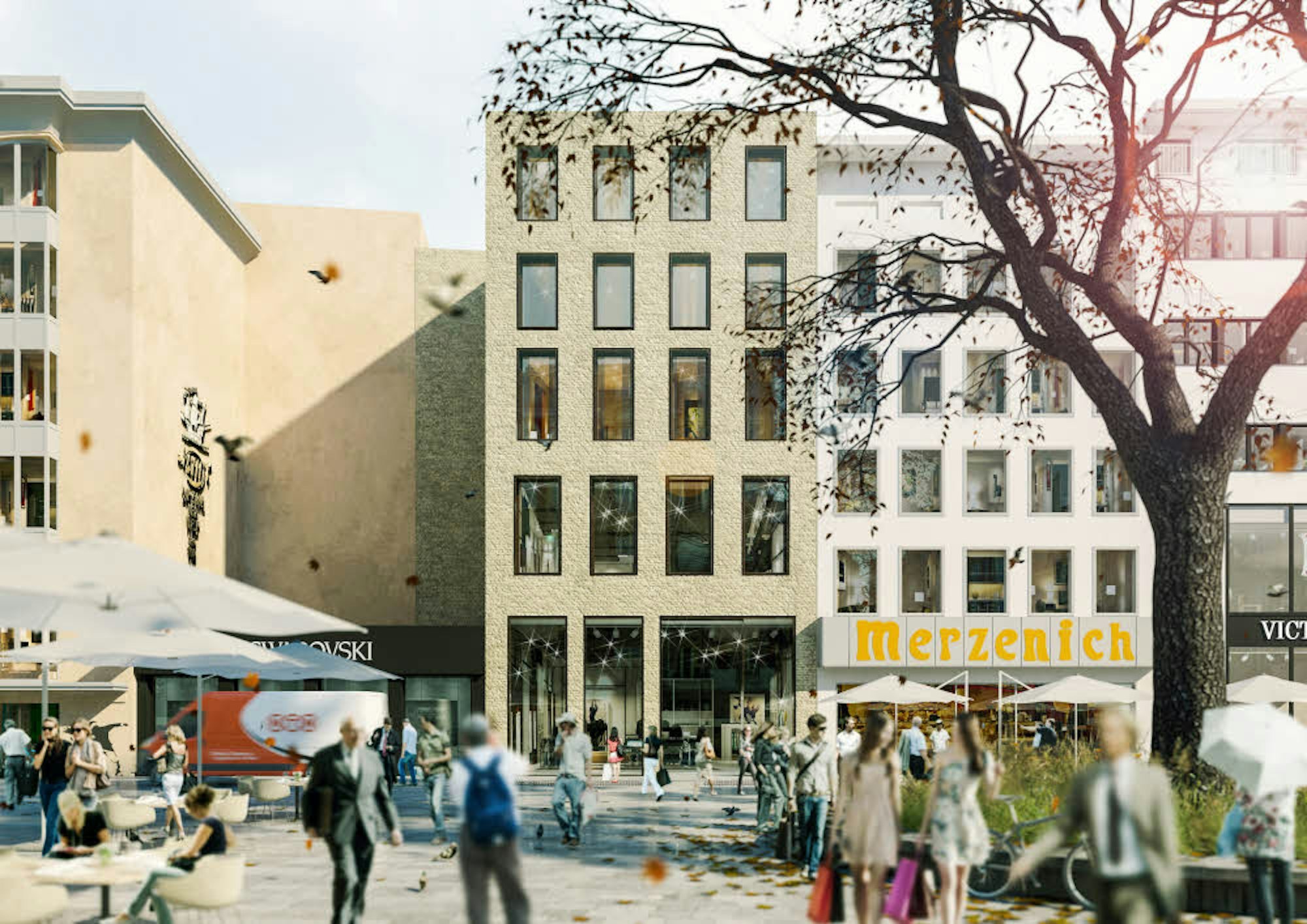 Auch in der Baulücke am Wallrafplatz zwischen Blau-Gold-Haus und „Merzenich“ tut sich was. Sie wird zur Hälfte mit einem Gebäude geschlossen, das wie der Neubau „Am Hof“ gestaltet wird. Die andere Hälfte der Baulücke ist nicht im Besitz der BVK. Hier bleibt vorerst der Flachbau mit dem „Swarovski“-Laden erhalten.