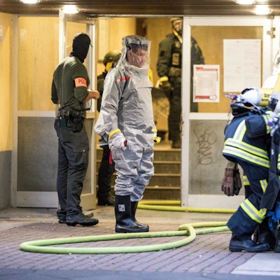 Ein BKA-Beamter in Schutzkleidung steht in dem Chorweiler Wohnkomplex.
