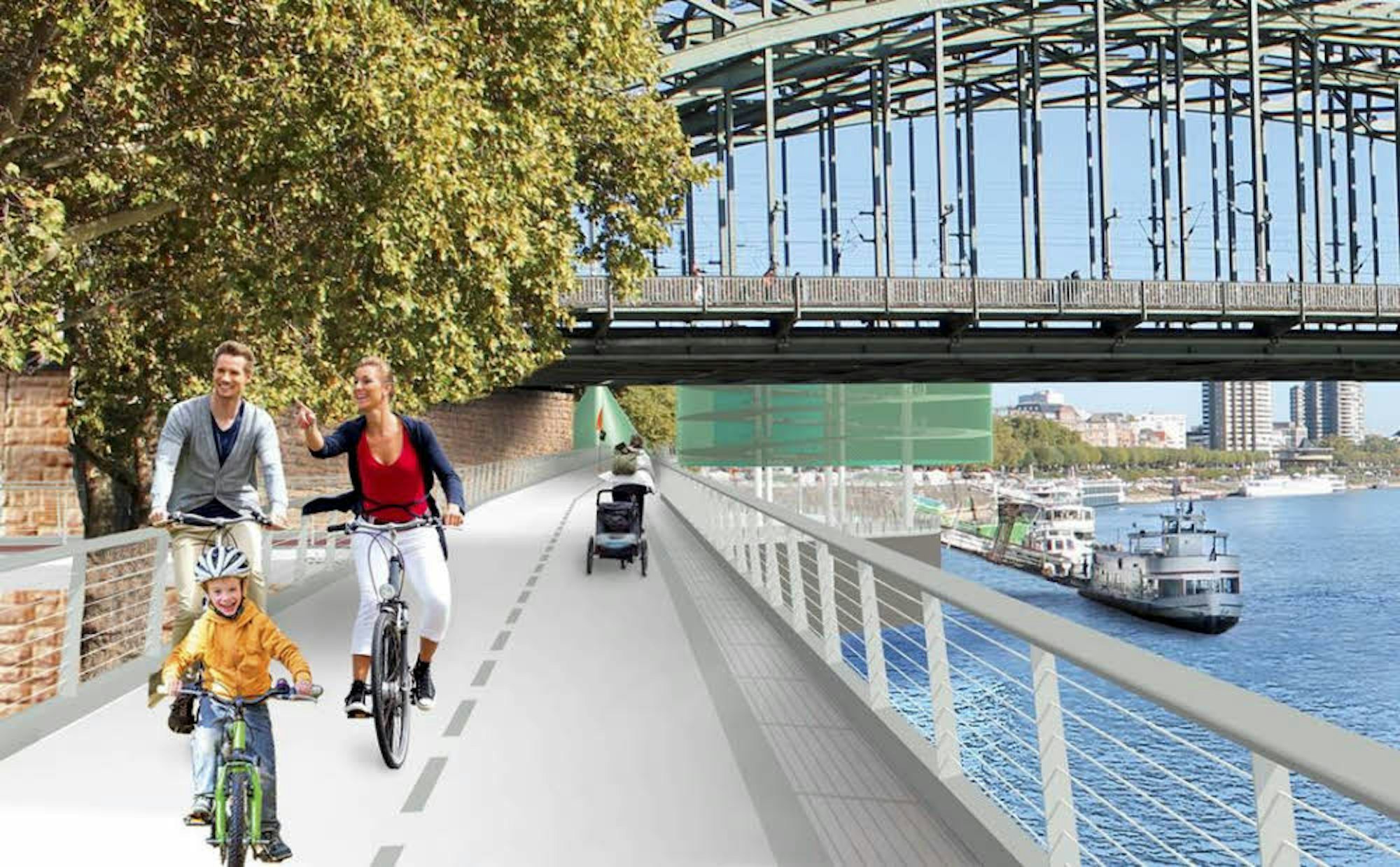 Weil es dort immer wieder zu Konflikten zwischen Fußgängern und Radfahrern kommt, hat der Kreisverband Köln des Allgemeinen Deutschen Fahrradclubs (ADFC) eine Vision für eine getrennte Verkehrsführung von Radfahrern und Fußgängern entwickelt. Unter dem Arbeitstitel „Skyride“ möchte der ADFC einen Hochradweg auf Stelzen entlang des Rheins führen – rund fünf Meter breit und in zwei Richtungen befahrbar. Vorbild sind innovative Radprojekte, wie sie in jüngster Zeit etwa in Kopenhagen realisiert wurden (siehe Kasten).