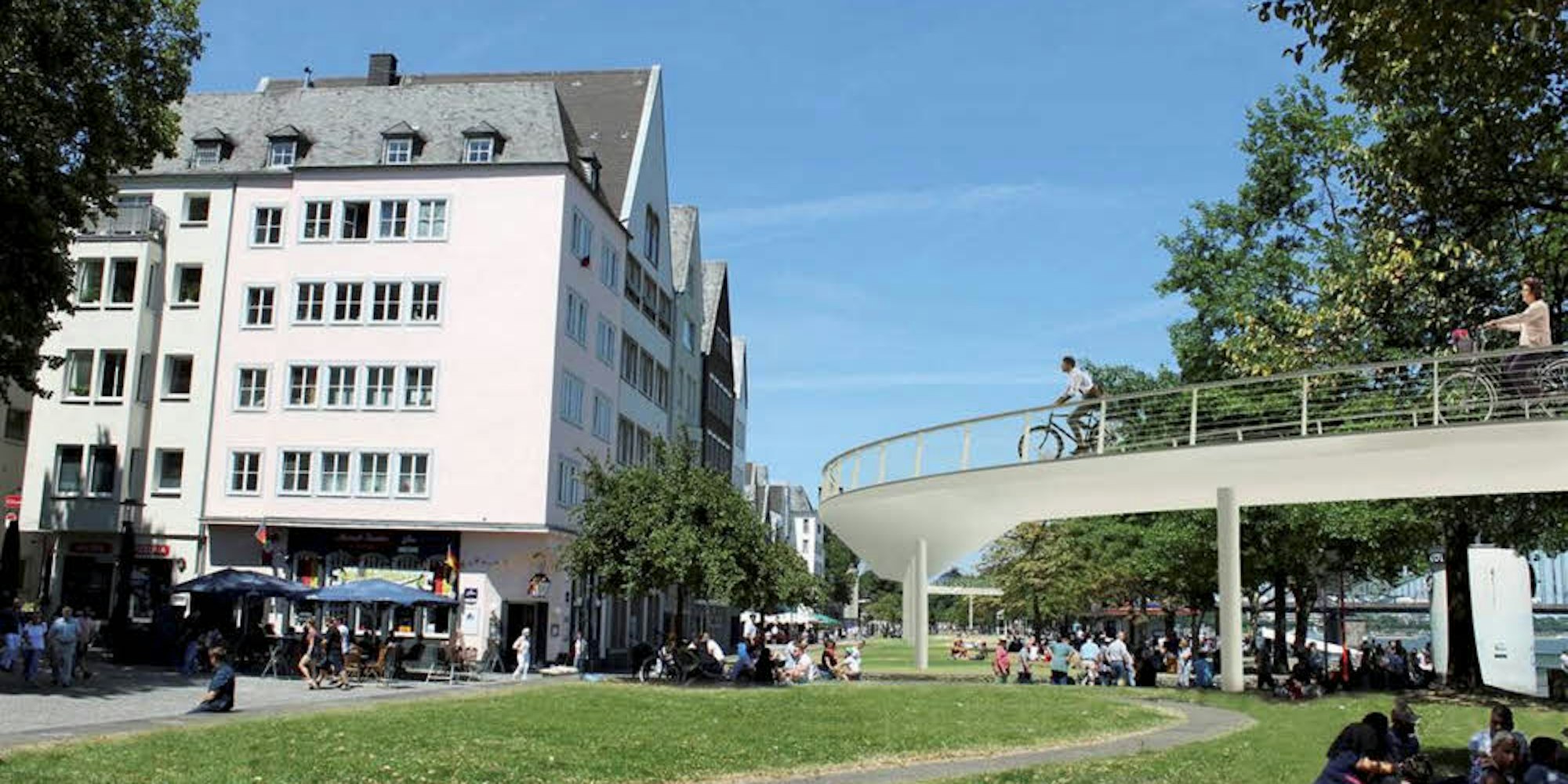 Die Pläne der Verwaltung sehen bislang vor, das Altstadtufer mit verschiedenen Sorten Basaltpflaster in eine „Verweilzone“ am Wasser, eine „Transitzone“ in der Mitte und eine „Ruhezone“ aufzuteilen, um die Konflikte zu minimieren. Die Umsetzung soll Anfang 2020 südlich der Deutzer Brücke starten, nördlich davon geht es frühestens 2022 los. Außerdem lässt die Stadt derzeit eine provisorische Fahrradrampe von der Hohenzollernbrücke zum Breslauer Platz planen. Über diese Projekte geht die Vision des ADFC weit hinaus. „Wir wollen damit eine Diskussion anstoßen und wünschen uns von der Stadt mehr Mut für Ideen, die über bloße Farbmarkierungen hinausgehen“, so Hölzel.