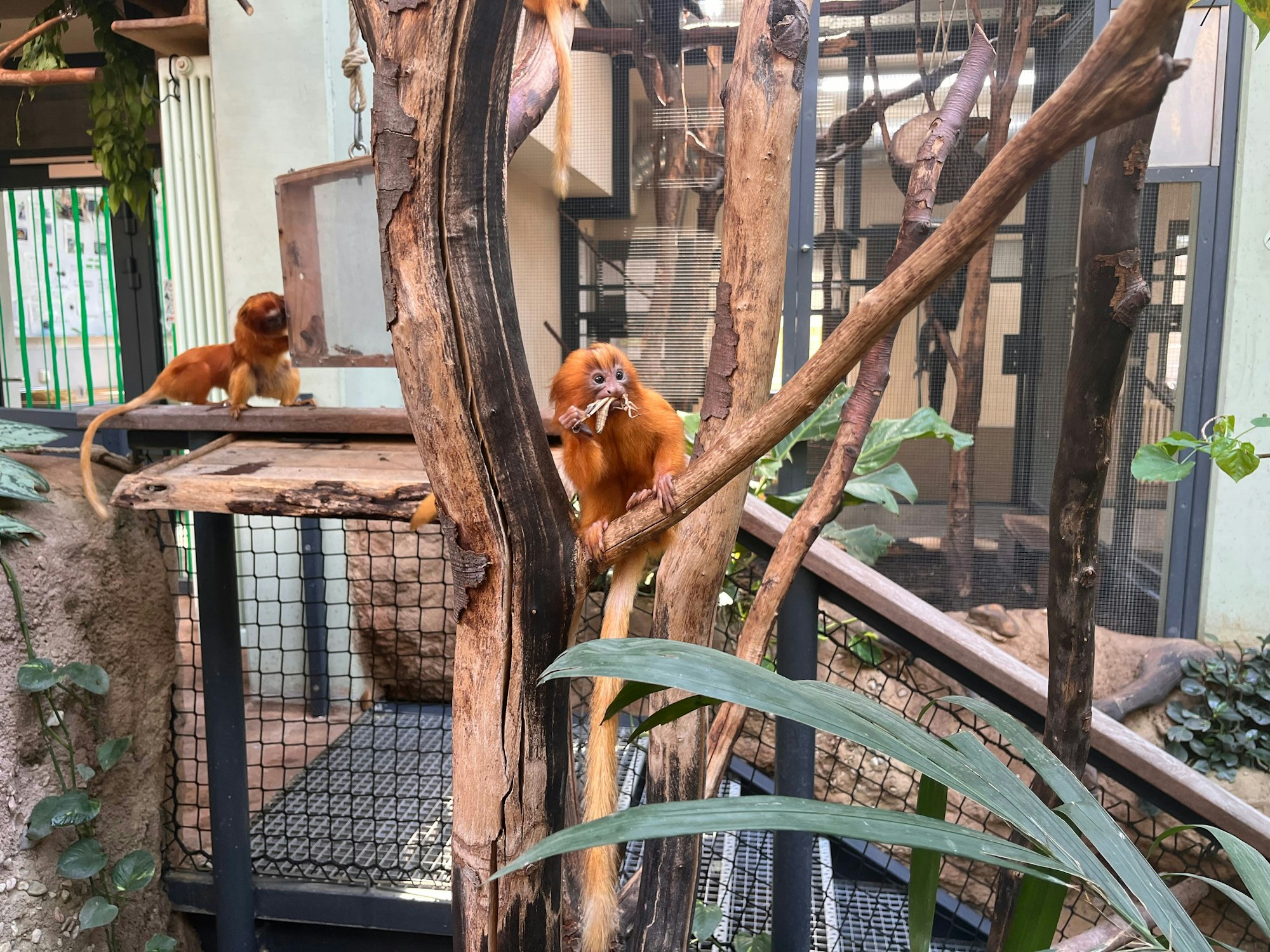 Im Arnulf-und-Elisabeth-Reichert-Haus wuseln seit Ende Februar zwei kleine goldgelbe Löwenäffchen zwischen Kakaobaum und Bromelie herum. Das Südamerika-Haus beherbergt insgesamt sechs der vom Aussterben bedrohten Krallenaffen und freut sich über den Nachwuchs des Löwenäffchen-Paares „Apu“ und „Nala“. Stolz erzählt Christoph Kiesow, Tierpfleger im Südamerika-Haus: „Wir dachten schon, Nala kann keine Babys mehr bekommen, die Schwangerschaft war dann eine echte Überraschung.“