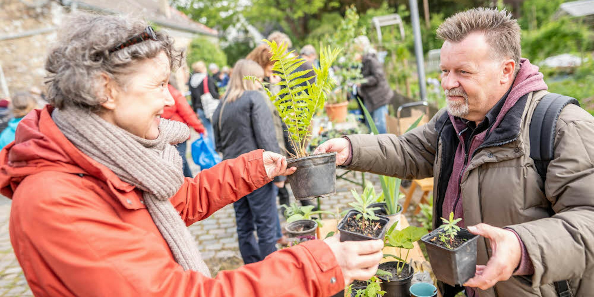 An den circa 30 Ständen hört man allerorten Tipps, Pflegeanleitungen, Diskussionen über den besten Standort, Schwärmereien über Blüten. Viele Besucher haben Pflanzen dabei, die sie tauschen möchten. Andere können sich Töpfe mitnehmen – gegen eine Spende für Zartbitter e.V., den Verein zugunsten von sexuell missbrauchten Kindern und Jugendlichen. Die Naturschutzorganisation BUND verteilt Samen und informiert über die besten Pflanzen für Bienen, Insekten und Schmetterlinge.