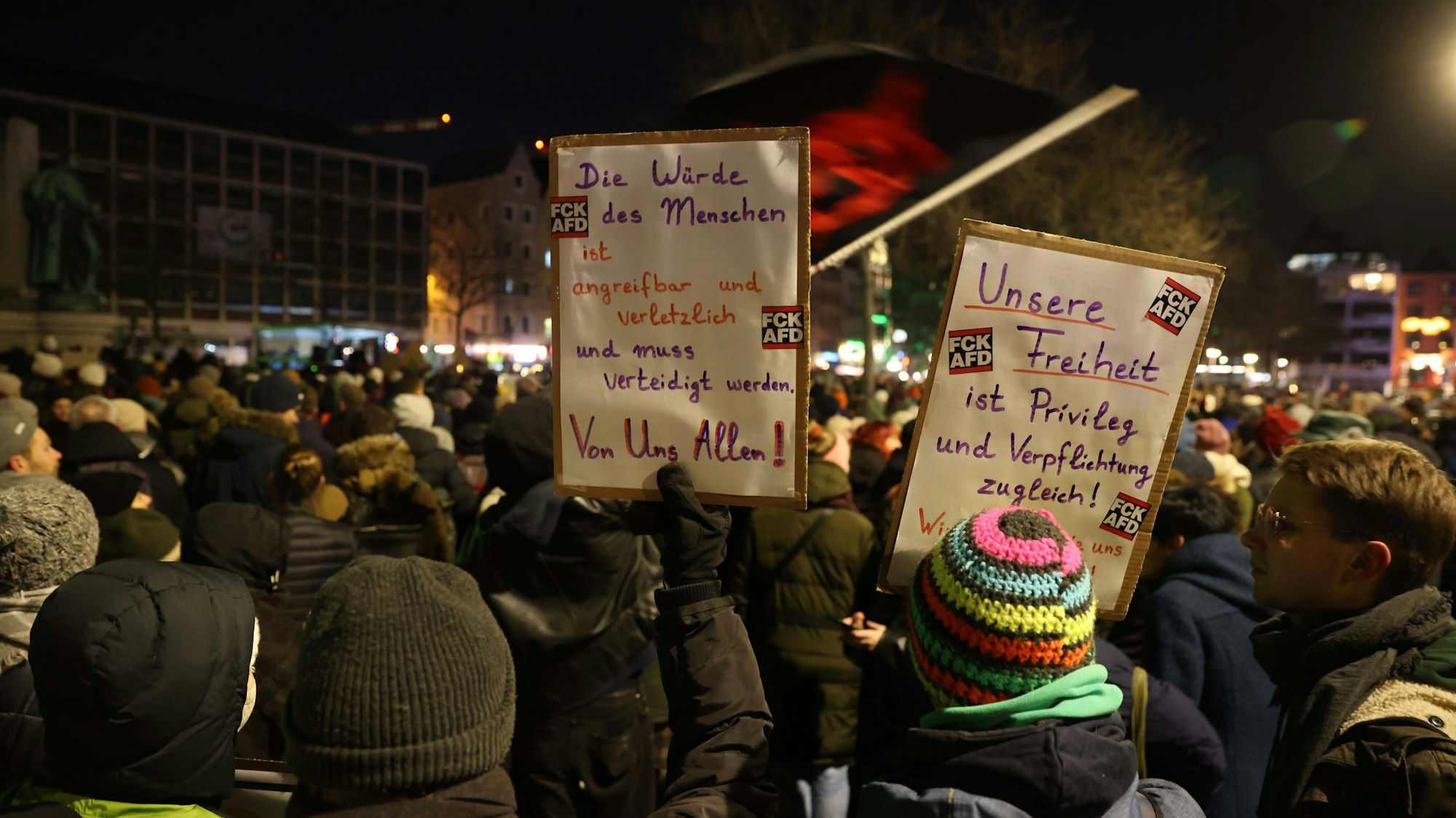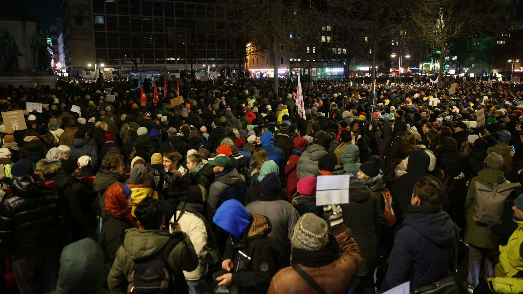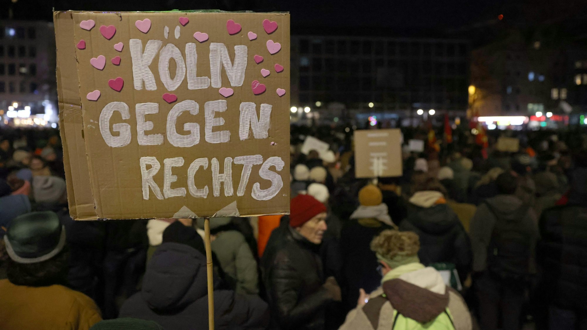 Die Resonanz ist riesig: Zehntausende Menschen sind dem Demonstrationsaufruf gegen Rechts und für Demokratie am Dienstagabend gefolgt. Dass Köln sich gegen Rechtsextremismus und Fremdenfeindlichkeit positionieren kann, haben die Kölnerinnen und Kölner in der Vergangenheit schon oft bewiesen. Doch diese Kundgebung sucht ihresgleichen. In Größe und Spontanität ist sie vielleicht nur vergleichbar mit der Arsch-Huh-Demo von 1992. Sah es anfangs noch so aus, als würden weit weniger Menschen als die 7000 angemeldeten Demonstranten zusammengekommen, waren es schließlich mehrere Zehntausende, die zum Heumarkt strömten. Das hatten weder die Anmelder noch die Polizei in dieser Dimension erwartet.