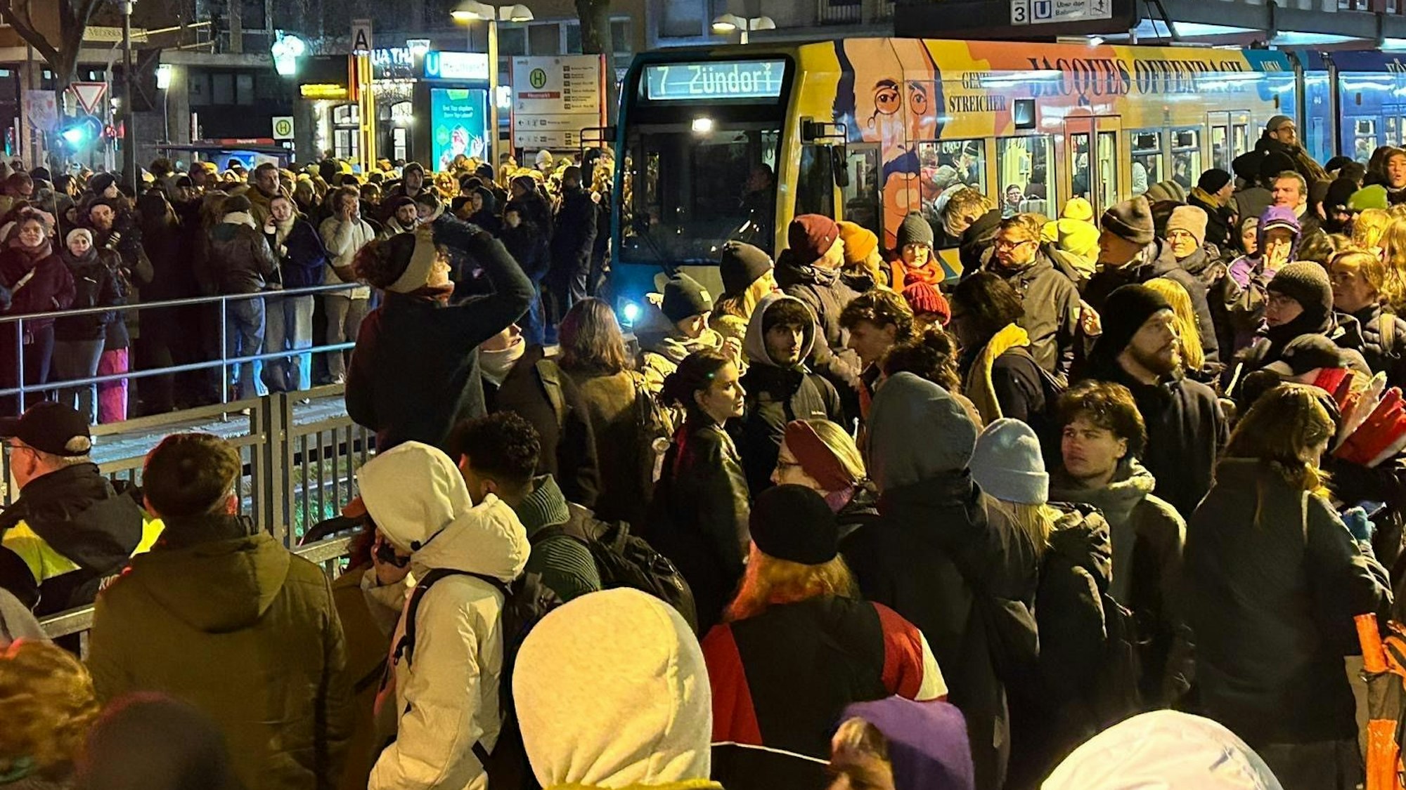20.30 Uhr: Die KVB fährt mittlerweile den Heumarkt nicht mehr an. Weil die Menschenmenge so groß ist, will die Polizei den Demonstrationszug umleiten zur Deutzer Werft. Der vorgesehene Weg durch die Altstadt ist aus Sicherheitsgründen nicht mehr realisierbar.