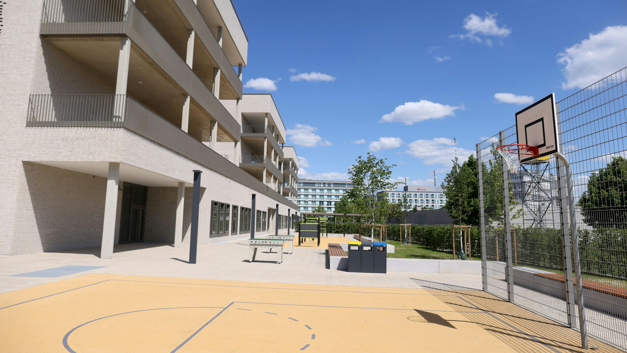 Besonders innovativ muten die beiden Zweifach-Sporthallen an, die übereinander gebaut sind. Um sie herum sind Büroräume, die größtenteils von Ulrich Beckmanns Firma genutzt werden sollen. Er wolle sich darum bemühen, dass seine Belegschaft in den Abendstunden ab und zu die Hallen nutzen könne, erklärte der Geschäftsmann. Ob das genehmigt wird, entscheidet die Stadt Köln. Denn der vermietet der Investor das Gebäude zunächst auf einen Zeitraum von 28 Jahren. Dass die Schule auch lange darüber hinaus noch genutzt werden wird, hält der Investor für höchstwahrscheinlich: „Hier ist eine sehr zentrale Lage. Ich gehe davon aus, dass die Gebäude über Generationen als Schule genutzt werden.“ Sollte sich die demografische Entwicklung grundlegend ändern, könnten im Gebäude neue Nutzungen umgesetzt werden. Die Innenwände in Trockenbau ließen sich flexibel entfernen. So könnte beispielsweise ein Seniorenzentrum entstehen.