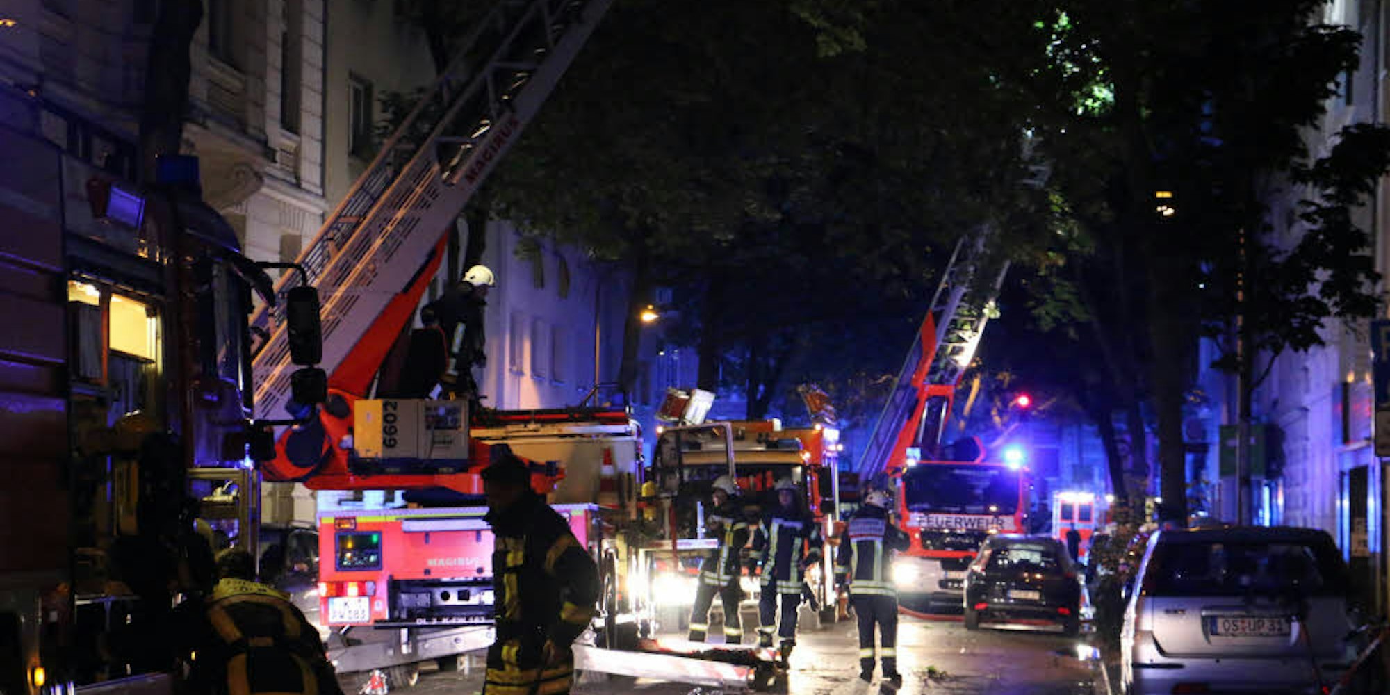 Weil sich das Feuer auf ein Nachbarhaus ausweitete, rückten insgesamt vier Löschzüge an. „Wir mussten das Dach öffnen und den gesamten Innenausbau der Dachgeschosswohnung abbrechen, um an die Glutnester zu gelangen“, sagte Feuerwehr-Sprecher Frank Peters. Insgesamt benötigten die Retter 30 Pressluftatmer. Dabei verletzte sich ein Retter an der Hand, ein anderer knickte um. Insgesamt setzte die Feuerwehr 80 Retter aus sechs Wachen ein, bei der Brandbekämpfung wurden zwei Drehleitern eingesetzt.