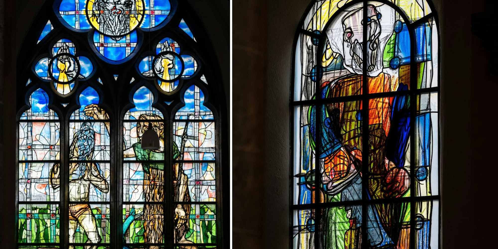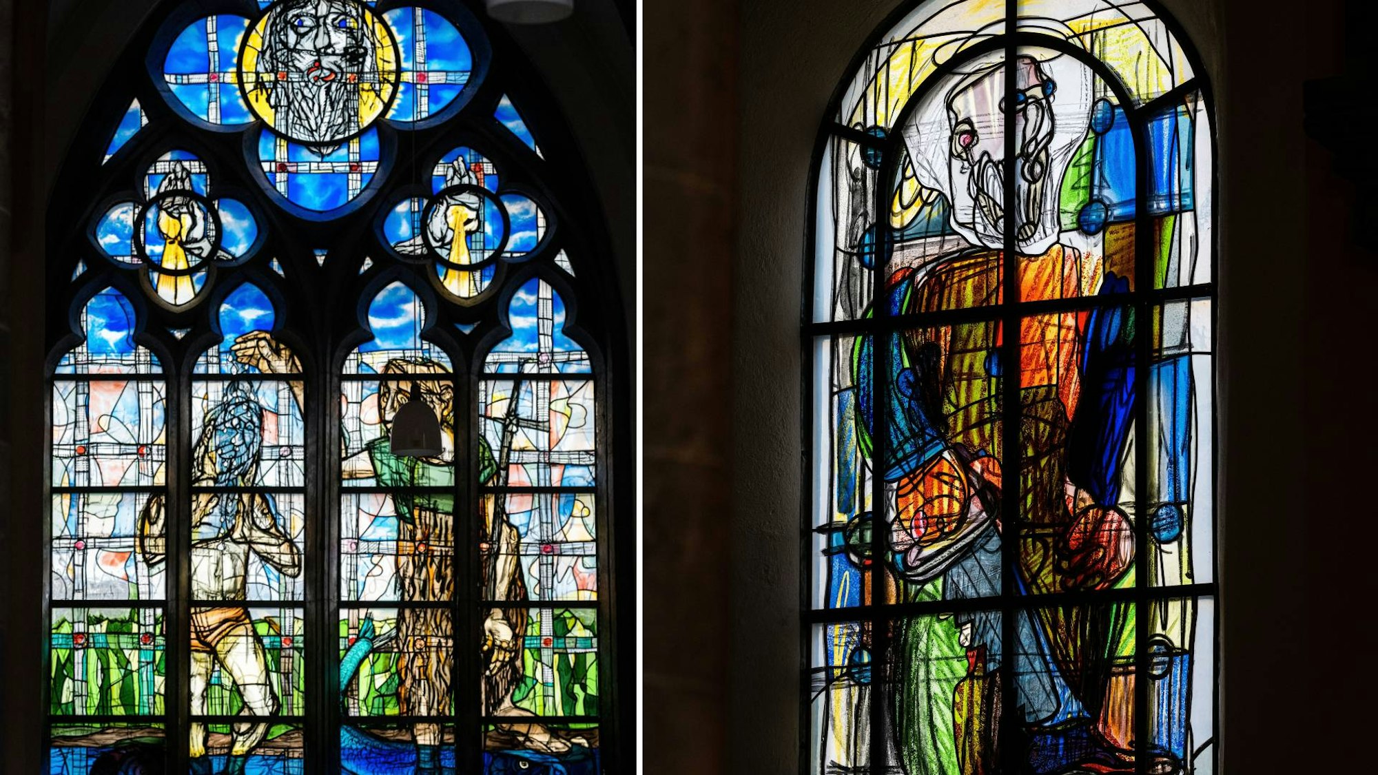 Das Josephfenster (r.) und das Tauffenster sind in St. Andreas angekommen. Zu Ostern wird das Fenster „Himmlisches Jerusalem“ erwartet.