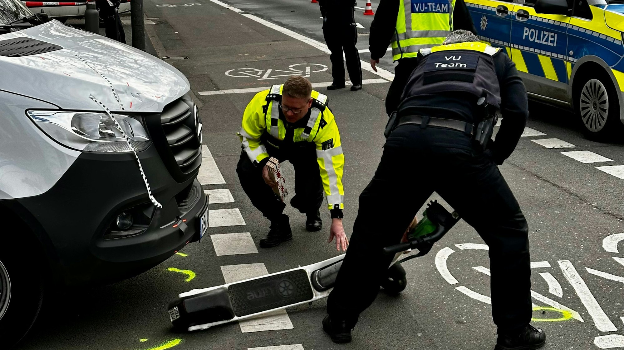 Polizeibeamte ziehen den E-Scooter unter dem Unfall-Fahrzeug hervor.
