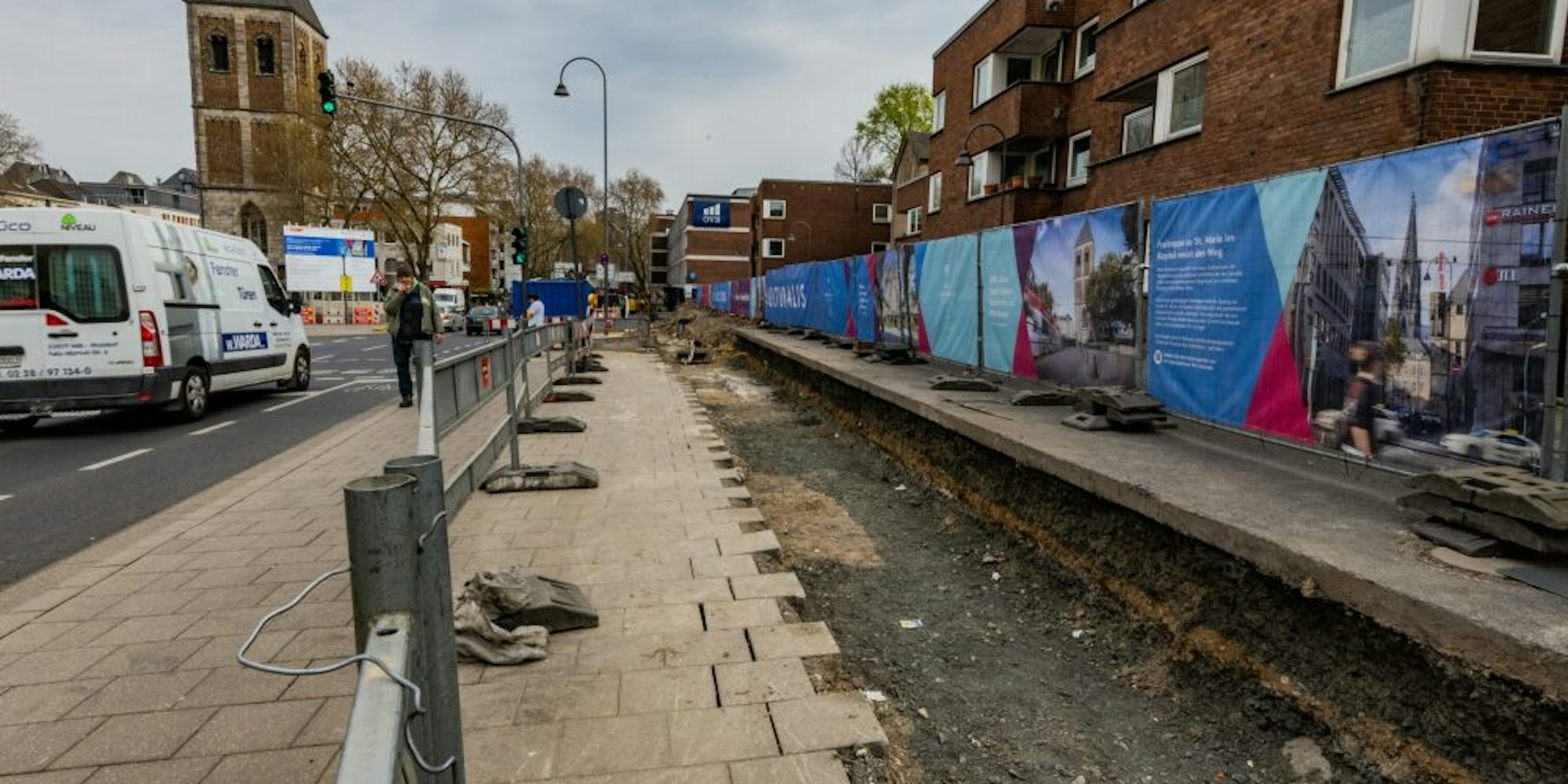 Bislang stand dort eine Stützwand, sie trennt die Pipinstraße von den etwas oberhalb stehenden Wohnhäusern und ist ein Sanierungsfall. Die Wand brachen Arbeiter ebenso ab wie die Garagen, dadurch soll der Blick auf St. Maria im Kapitol wieder freier sein. Schon 2017 sagte der Leiter des Amtes für Straßen und Verkehrstechnik, Klaus Harzendorf: „Durch die Treppe wird die Kirche gut inszeniert, sie bildet einen guten Abschluss der ,Via Culturalis'.“ Ebenso wird der Gehweg breiter und die Situation für Radfahrer wird ebenfalls laut Stadt verbessert. (mhe)