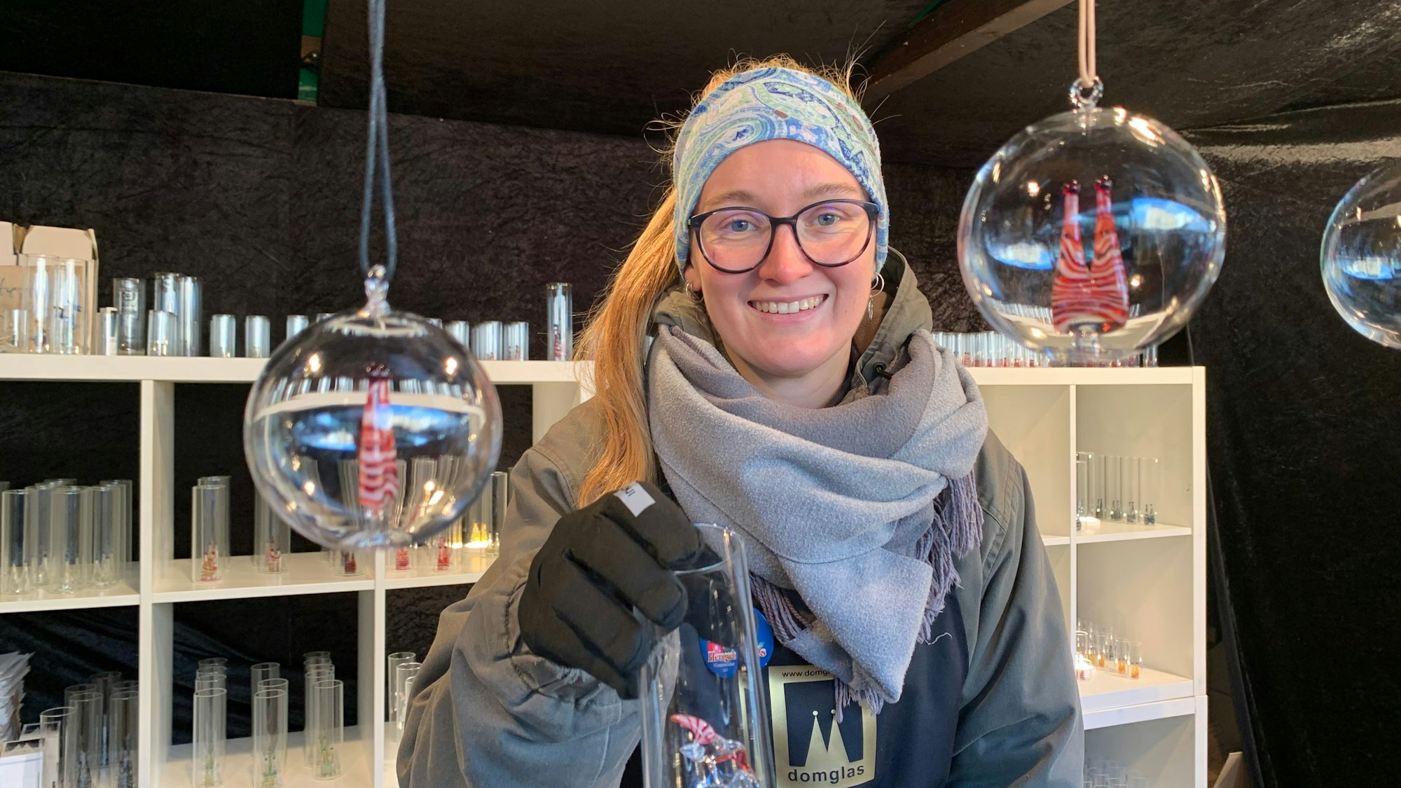 Kleine Kunstwerke verkauft Caroline am Stand von „Domglas“ am Heumarkt. Die Gläser haben eine Tanzmarie, Geißbock Hennes oder natürlich die Domspitzen eingearbeitet. Jedes Glas ist ein Unikat und handgefertigt, verspricht die Händlerin. So viel gläserner Lokalpatriotismus zieht auch einheimische Besucher an. "Wir haben schon gut verkauft", sagt die junge Frau und lächelt durch eine Christbaumkugel mit Domtürmchen. Zwischen 35 und 350 Euro kosten die edlen Objekte. Es gibt insgesamt fünf Stände der Bergisch Gladbacher Manufaktur auf den Märkten.