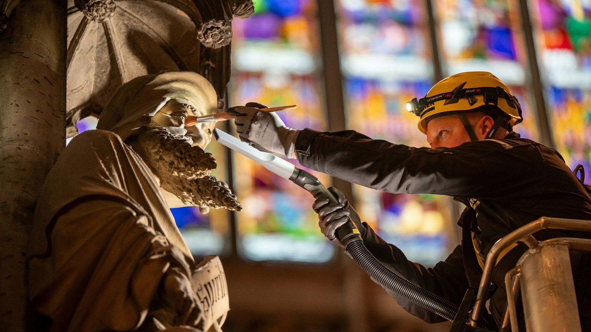 Nun die Innenwände der Westturmhalle: Das Unternehmen mit Sitz im baden-württembergischen Winnenden sponsort spezielle Hebebühnen, die kompakt genug sind, um durch die Portale zu kommen und zugleich die notwendige Arbeitshöhe erreichen können. Damit die Aktion nicht zu einem Höllenfahrtskommando wird, wurde das Gewölbe unter dem Fußboden der Westturmhalle mit Baustützen verstärkt. Darunter befindet sich nämlich nichts Geringeres als die Domgrabungen. So können die Reinigungsspezialisten sorglos auffahren ins Gewölbe und dort mit Nass- und Trockensaugern sowie verschiedenen Düsenaufsätzen – teils mit Echthaar besetzt – vor allem die abgelagerten Reste von Kerzenruß, vermengt mit Staubpartikeln entfernen.