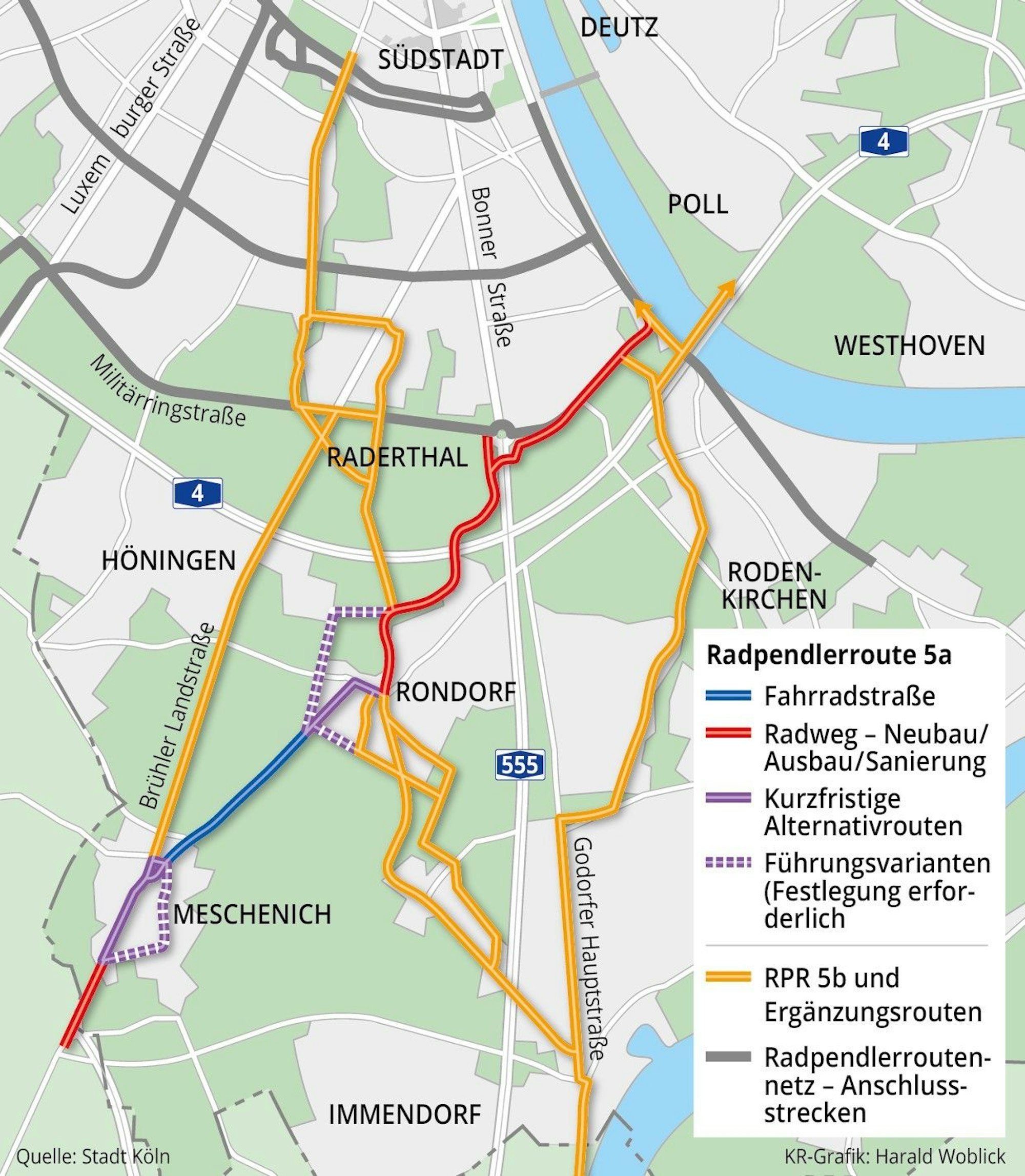 Dort sind für die Wegeführung verschiedene Varianten möglich (siehe Grafik). Es soll eine Öffentlichkeitsbeteiligung stattfinden. Es geht weiter bis zum Verteilerkreis Süd, dann über den Militärring bis schließlich zur Severinsbrücke. Die unter der Nummer 5b laufende Route schließt Wesseling an und läuft in einer Variante über Immendorf nach Rondorf. In einer anderen geht es durch Godorf nach Rodenkirchen. Und wann ist mit der Umsetzung zu rechnen? Die Verwaltung hat sich bisher das Okay des Verkehrsausschusses geholt, um in einem ersten Schritt in die Planung einzusteigen. Die könnte zeitintensiver werden, denn unter dem Spardruck wird auf ein externes Büro verzichtet.