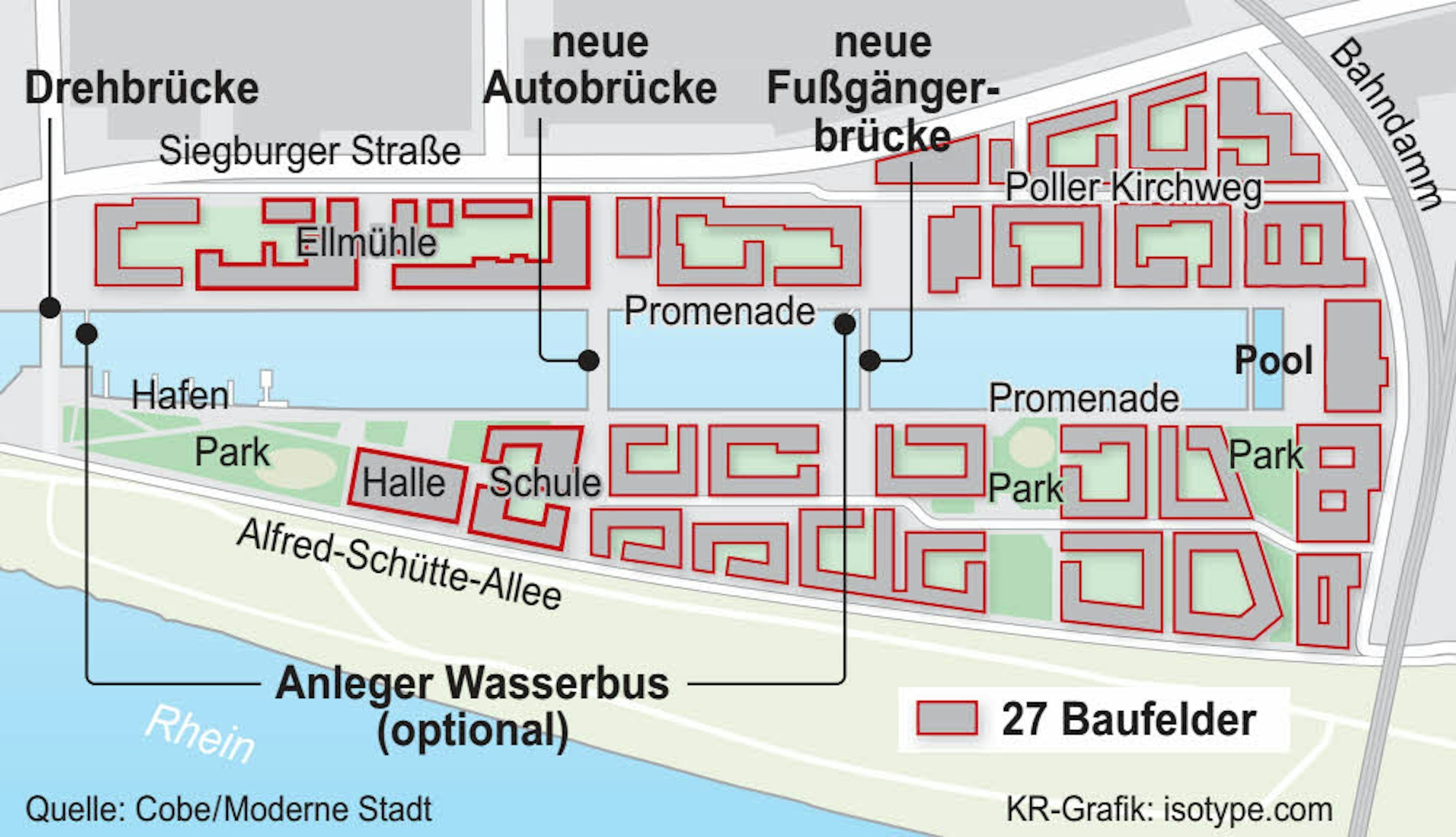 Bislang weist das Hafenbecken nur eine Brücke auf, und zwar die Drehbrücke an der Einfahrt. Doch sie lässt sich im Notfall so drehen, dass Schiffe sie passieren können, etwa bei Hochwasser. Die Pläne für den Deutzer Hafen sehen aber jeweils eine weitere Autobrücke und eine Fußgängerbrücke vor (siehe Grafik). WSA-Sprecher Christian Hellbach sagte: „Es kann bei Hochwasser durchaus passieren, dass die Durchfahrtshöhe nicht mehr ausreicht.“ Man wolle sich alle Optionen offen halten. Die Verwaltung teilte mit: „Die geplante Hafenbrücke ist elementar für die Erschließung und Entfluchtung des neuen Stadtquartiers.“ Demnach habe auch kein Schiff beim vergangenen Hochwasser das Hafenbecken zum Schutz genutzt.
