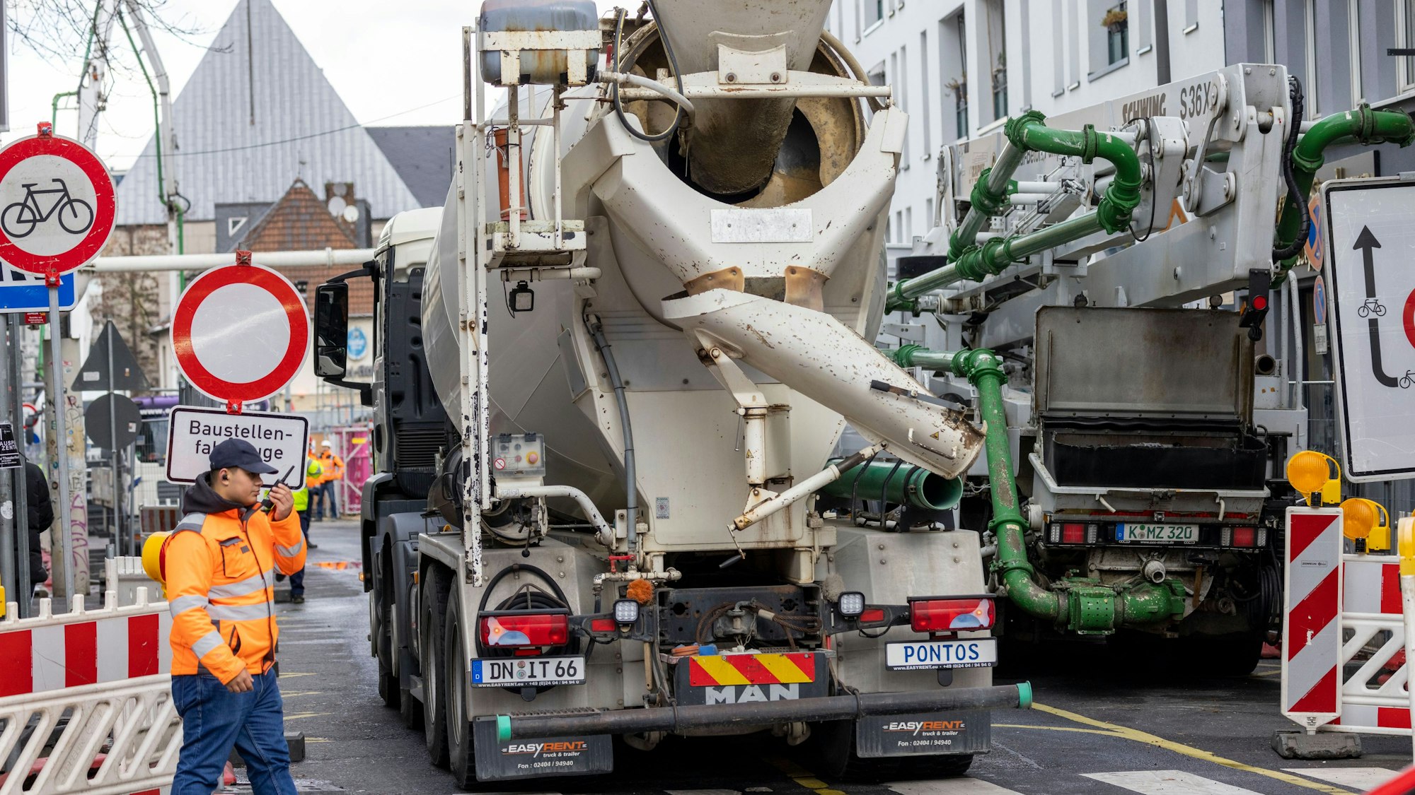 Doch eben diese Arbeiten wurden nicht wie vorgesehen fertig. Nun aber rollten die Betonmischfahrzeuge. Zwei Drittel der rund 170 Lkw kamen von Süden über die Severinstraße an, das restliche Drittel vom Norden über die Bäche. Vorgesehen war ein Ende der Maßnahme für 4 Uhr am Mittwochabend. Zumindest bis Dienstagabend stand diesem Zeitplan nichts im Wege. Auf der Großbaustelle nahm ein Heer von Koordinatoren und Ingenieuren der mit der Sanierung beauftragten Baufirmen die Betonmischfahrzeuge in Empfang und lotsten sie an die beiden Pumpen.