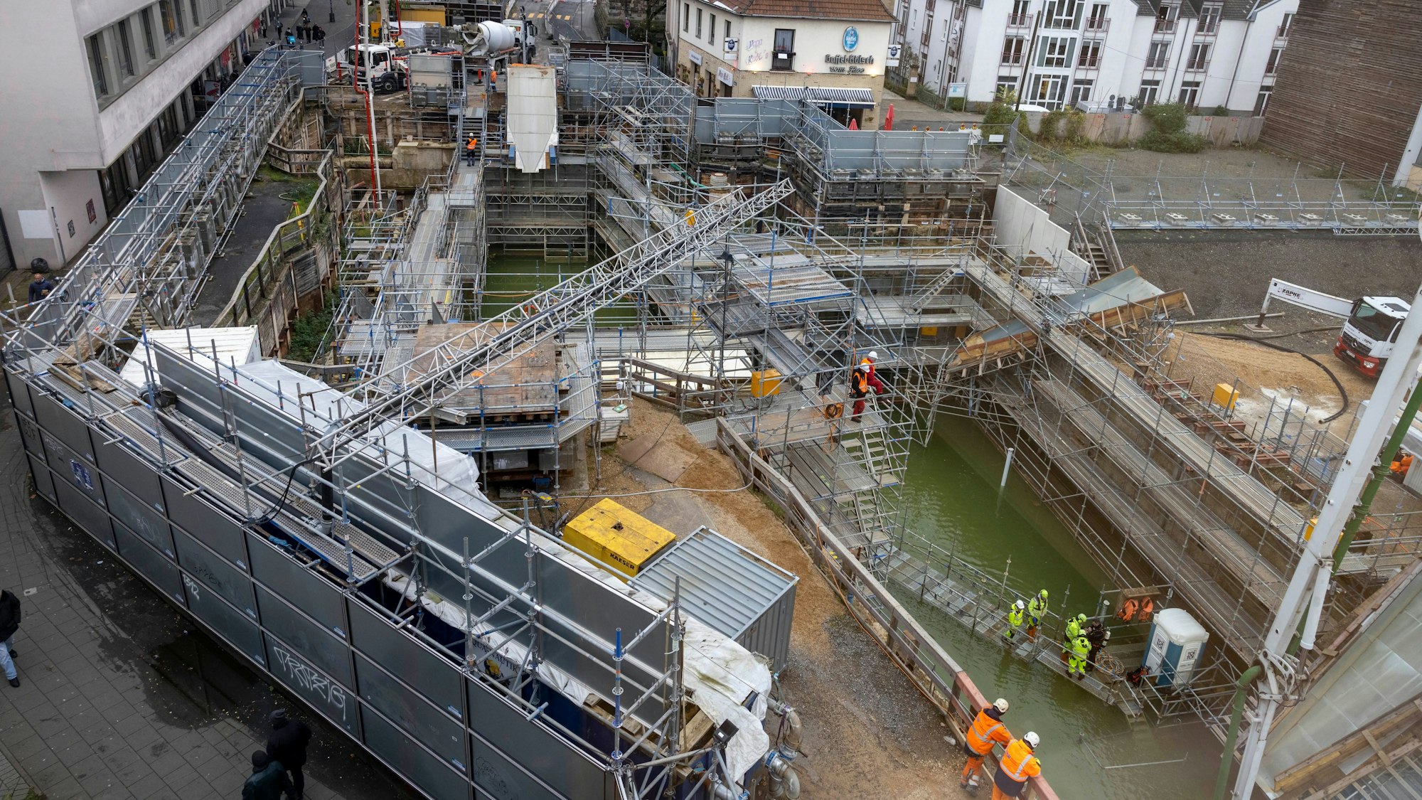 „Bis jetzt verläuft alles nach Plan“, vermeldet eine Sprecherin der Kölner Verkehrs-Betriebe am späten Nachmittag des Dienstags. Der Plan sieht vor, dass innerhalb von rund 17 Stunden an die 170 Betonmischfahrzeuge aus drei Betonwerken im Umland den Waidmarkt aus zwei Himmelsrichtungen ansteuern. Sie beschicken zwei Betonpumpen auf dem Baugelände stetig mit Beton, damit diese ohne Unterbrechung 1400 Kubikmeter der grauen Masse in die unterste Ebene des Bauwerks verbringen können. Der Beton wird auf ein Kiesbett geschüttet, das im Vorfeld so eingebracht wurde, dass ein ebener Untergrund entsteht. Dieser Arbeitsschritt wurde von Tauchern vorbereitet, weil das Grundwasser seit dem Archiveinsturz in das Bauwerk eingedrungen ist.