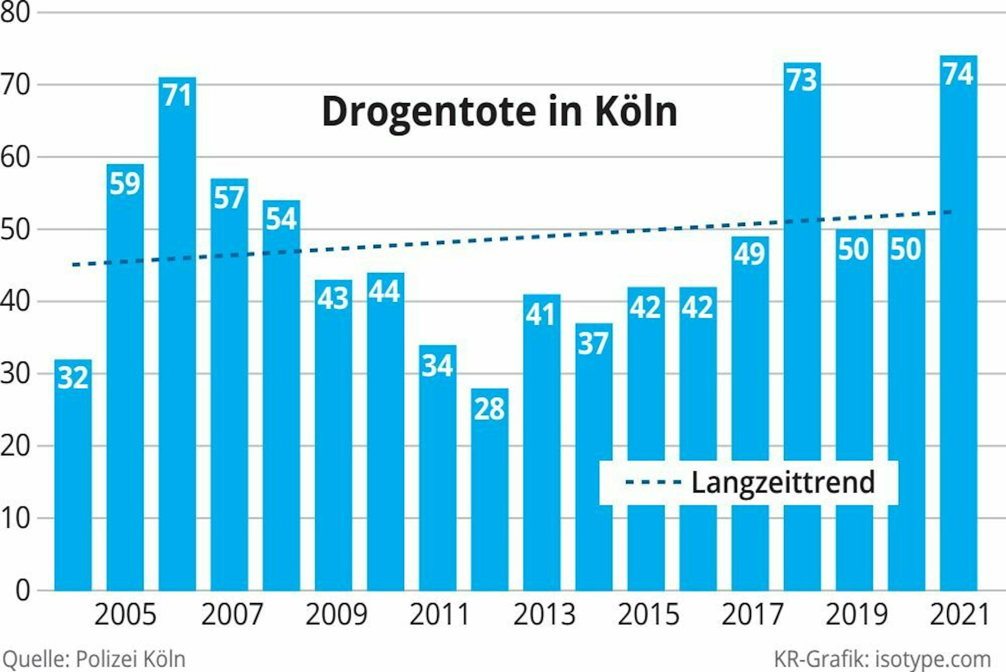 Unter den 74 Drogentoten des Jahres 2021 in Köln waren 15 Frauen und 59 Männer. Die meisten von ihnen gehörten zu der Altersgruppe der 41- bis 50-Jährigen. Das Durchschnittsalter wurde mit 45 Jahren angegeben, NRW-weit betrug es 44 Jahre.
