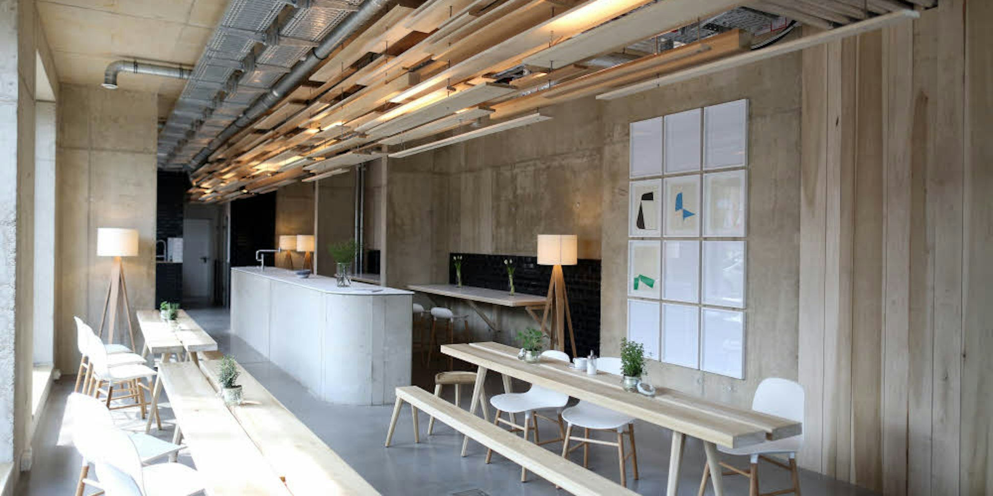 Raue Betonoptik mit Eichen-Akzenten: Der Gemeinschaftsraum besticht auch mit der hölzernen Lichtinstallation.