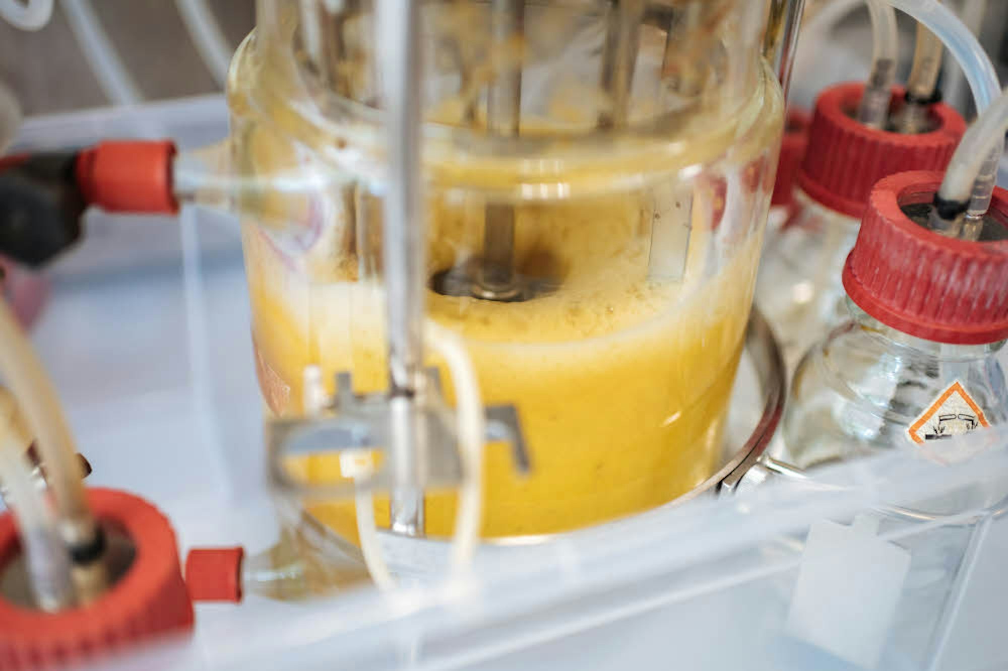 In einem Glaskolben werden Zucker und Darmbakterien verrührt. Die Farbe stammt von den Carotinoiden.