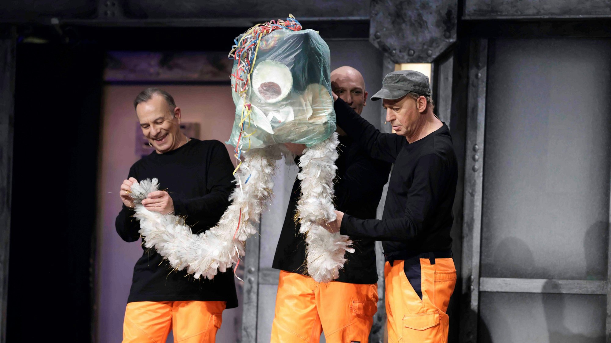 Poetisch: „AWB“: Ein Trupp von Müllmännern bringt ohne Worte Abfall zum Tanzen und zum Leben. Erinnert ein bisschen an das Schweizer Maskentheater Mummenschanz, das ebenfalls aus Wegwerfgegenständen Wesen macht.