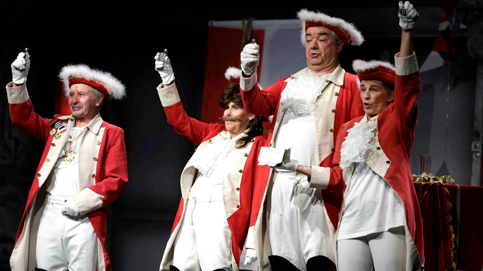 Alarm bei den Roten Funken. „Die Wehrkraft von uns steht auf dem Prüfstand“, verkündet Gardisten-General Pitter (Didi Jünemann). Das Ergebnis stellt sich, nach Bestandsaufnahme des Waffenarsenals – 500 Holzgewehre, drei Gulasch- und zwei Konfettikanonen – als niederschmetternd heraus: „Wir sind nicht kriegstauglich.“ Es muss gehandelt werden. Wie gut, dass der Schwiegersohn des Generals umgehend Waffen liefern kann, für schlappe 50.493 Euro, inklusive Tarnuniformen des Modells „volljekotz Barbarossaplatz“.