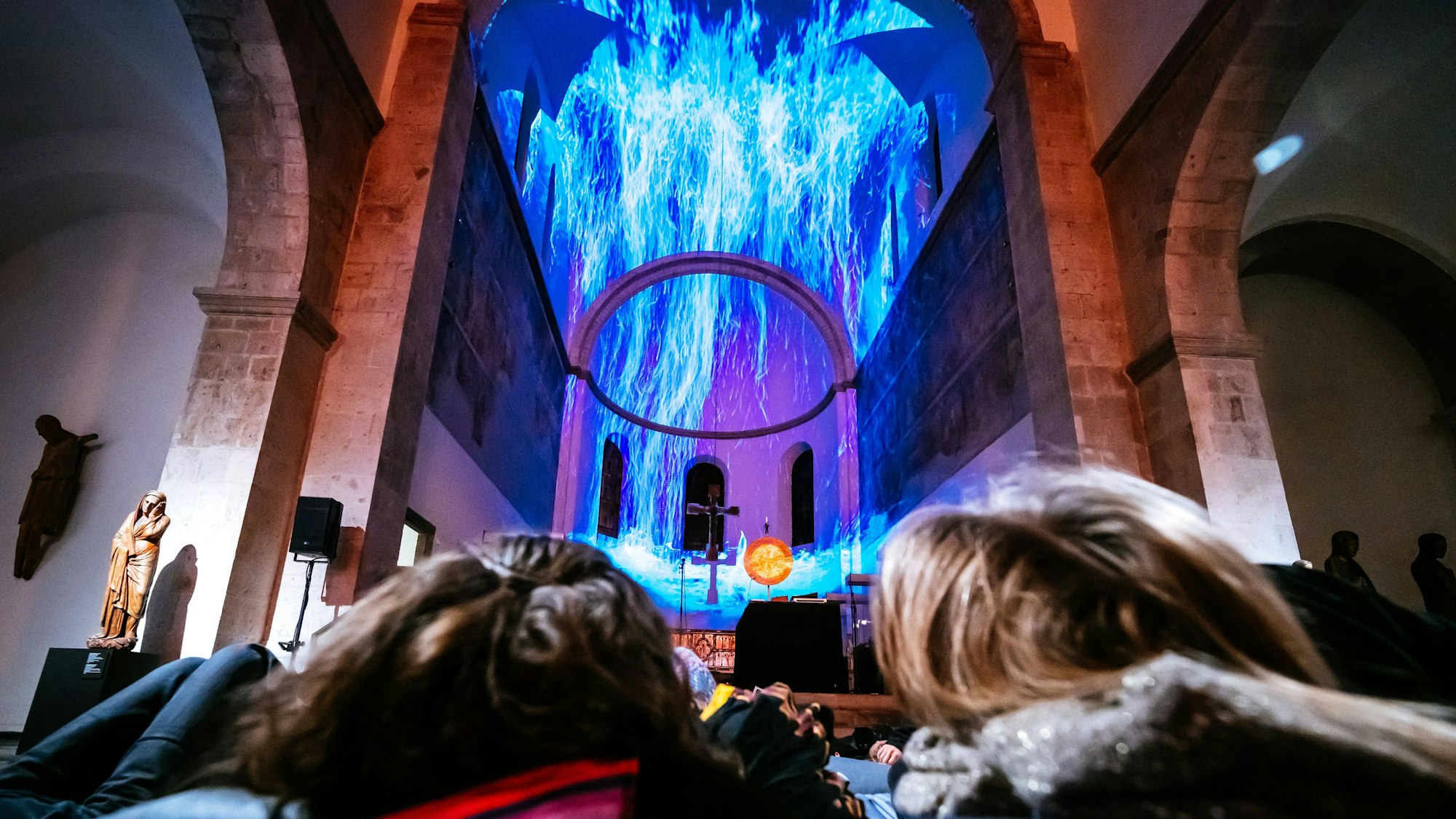 Die im 12. Jahrhundert erbaute romanische Cäcilienkirche, das Herzstück des Museum Schnütgen, ist auch für sich gesehen schon imposant. Seit ein paar Jahren werden in der Museumsnacht dort visuelle Elemente mit mehreren Beamern an das Kirchenschiff geworfen, im Einklang mit elektronischer Musik. Auch in diesem Jahr war das Schnütgen wieder ein Publikumsmagnet, die Sitzsäcke auf dem Kirchenboden auch zu später Stunde immer besetzt.