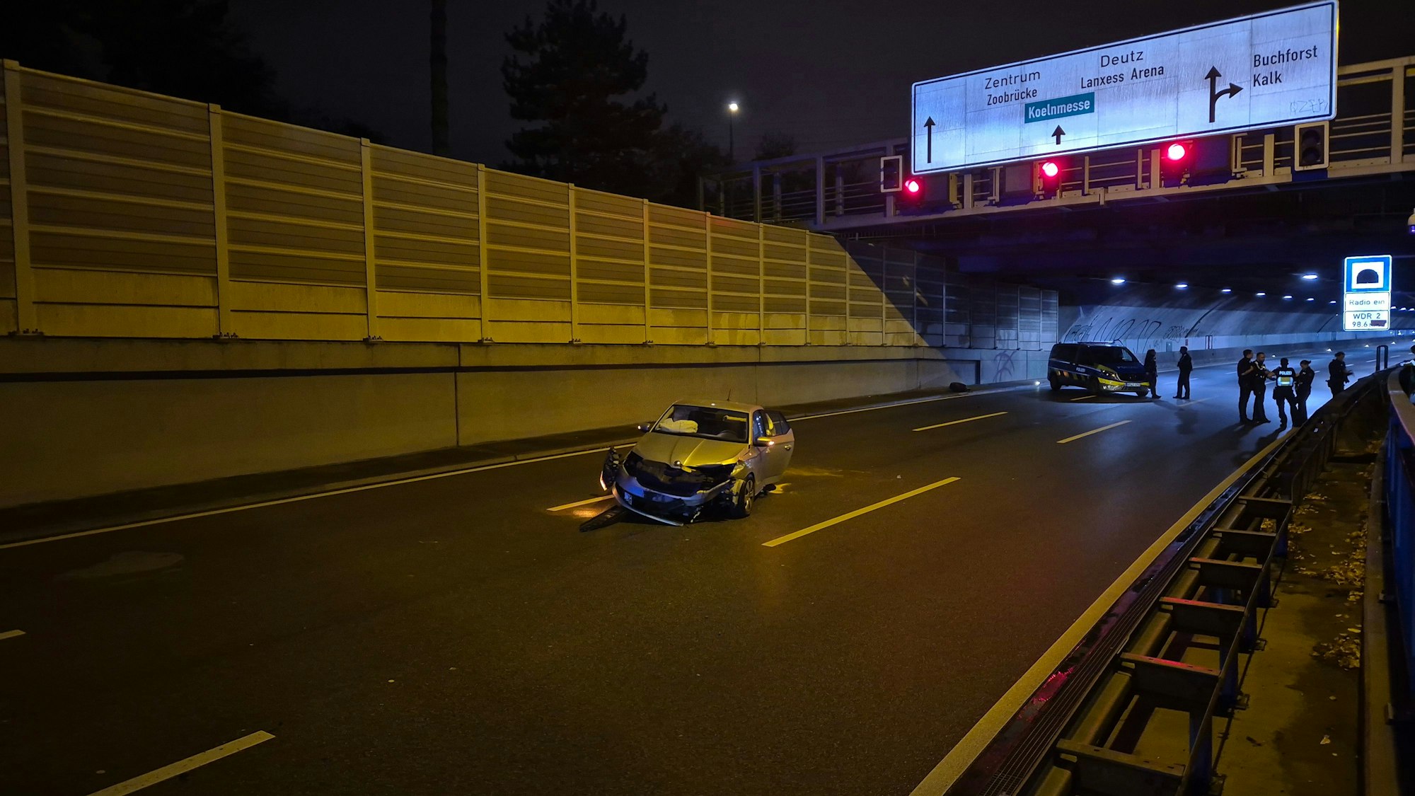 Nach ersten Zeugenaussagen war der 21-jährige Mercedesfahrer aus dem Rhein-Erft-Kreis um 22.35 Uhr in Fahrtrichtung Zoobrücke, kurz vor der Unterführung Germaniastraße/Remscheider Straße beim Spurwechsel auf den vorausfahrenden Skoda aufgefahren und hatte diesen gegen die Leitplanke geschleudert. Polizisten fanden in der Nähe der Unfallstelle eine Flasche mit Lachgas. Ob diese dem Fahrer zuzuordnen ist und er unter dem Einfluss von berauschenden Mitteln stand, ist Bestandteil der laufenden Ermittlungen. Aufgrund neuer Nachweismöglichkeiten von Lachgas wurde die Entnahme einer Blutprobe angeordnet.
