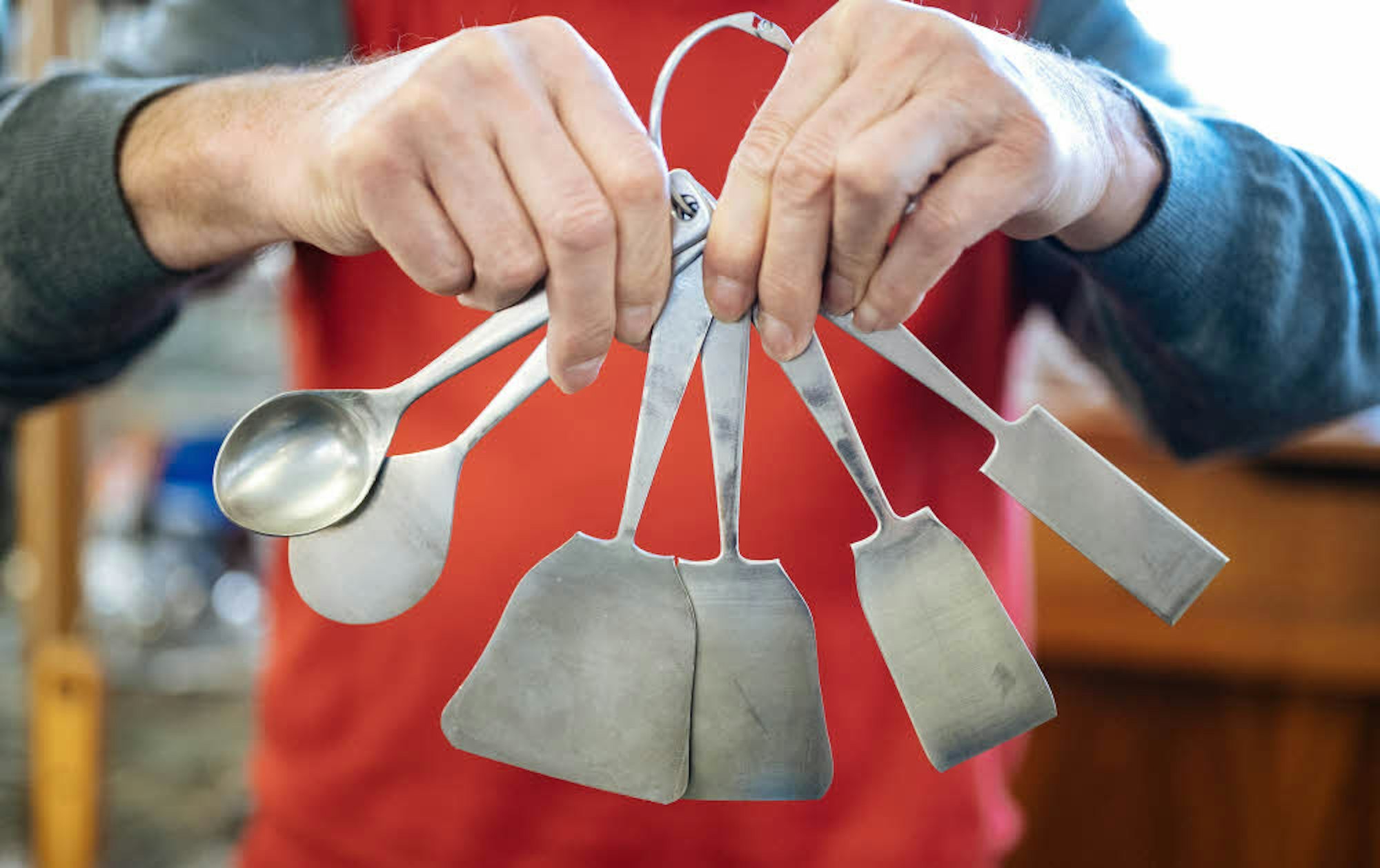 Mit einem Modell erklärt er, wie ein Löffel entsteht: Eine Blechtafel wird zuerst in Streifen geschnitten, dann in mehreren Arbeitsschritten dünner und breiter gewalzt, anschließend wird die Löffelform ausgestanzt und zwischen einem Unter- und Oberwerkzeug in Form gebracht. Einen Qualitätslöffel erkennt man zum Beispiel am schmalen Rand der Löffellaffe. „Sonst schiebt man die Suppe ja nur vor sich her“, sagt Hermann Freiß. Gutes Besteck hat seinen Preis. Ein vierteiliges, dezent verziertes Set mit Messer, Gabel und zwei Löffeln im eigenen grünen Samtkästchen eines namhaften Herstellers kostet zum Beispiel 200 Euro, ein anderes sogar 414 Euro. „Unsere Stärke sind Manufaktur-Bestecke, die heute in Kleinstmengen hergestellt oder kundenspezifisch produziert werden“, erklärt der Inhaber.