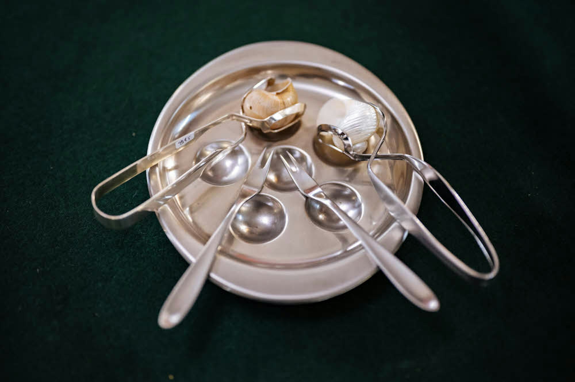 Wenn Hermann Freiß Zeit hat, poliert er das Silber. „Es reagiert mit Schwefel, das bei fossilen Brennvorgängen freigesetzt wird“, erklärt der Fachmann. Die Autos, die draußen vorbeifahren, sorgen also beständig dafür, dass das Besteck in den Schaufenstern anläuft: „Wenn man hinten fertig ist, fängt man vorne wieder an.“ Gerade ist ein Pastetenheber dran: „Den kennt man auch nicht mehr.“ Bei Glaub gibt es sogar Kaviarspachtel und Hummerstäbe (für 29,90 Euro) oder Schneckenzangen (für 81 Euro). Aber auch Alltägliches, wie Tortengabeln mit einem breiteren und zugespitzen Zinken – übrigens ein typisch deutsches Produkt: „Damit lässt sich ein Mürbeteigboden gut zerteilen“, sagt Hermann Freiß.