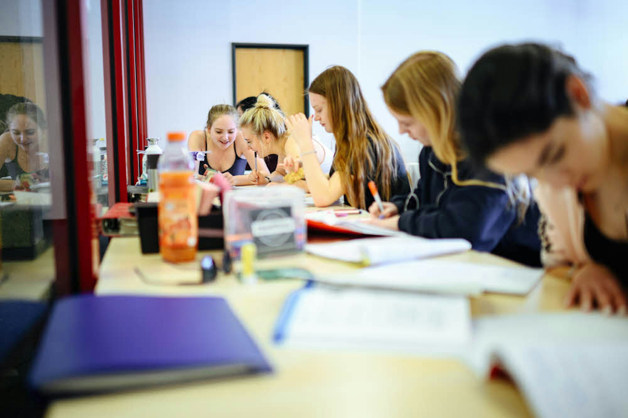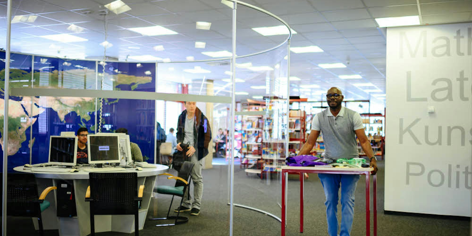 Als „dritten Ort“ neben Zuhause und dem Arbeitsplatz begreift die Direktorin die Bibliothek. Den Vorschlag, dass dieser Ort sonntags zugänglich sein sollte, begrüßt sie. Die Gymnasiasten im Gruppenarbeitsraum sehen das ähnlich. Äußerst kommunikativ, wenn auch nicht laut, sitzen sie in Paaren, Vierer- oder Sechsergruppen an den Tischen.