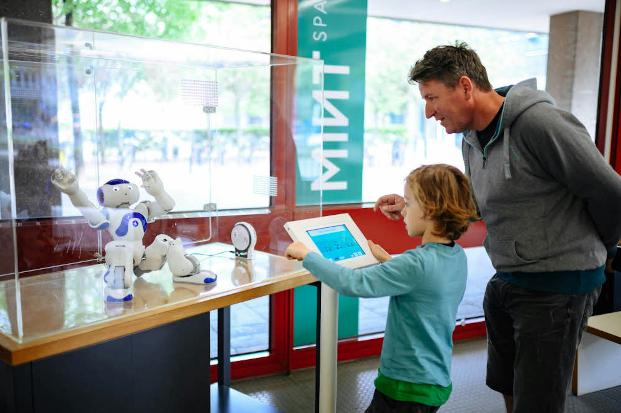 Zweitklässler Liam dagegen ist schon ein alter Hase. Er bedient den Roboter NAO im „MINT-Space“, einer Ecke neben dem Eingang im Erdgeschoss. „MINT“-Themen, also Themen aus den Bereichen Mathematik, Informatik, Naturwissenschaft und Technik, sind in der Stadtbücherei allerorten erfahrbar.