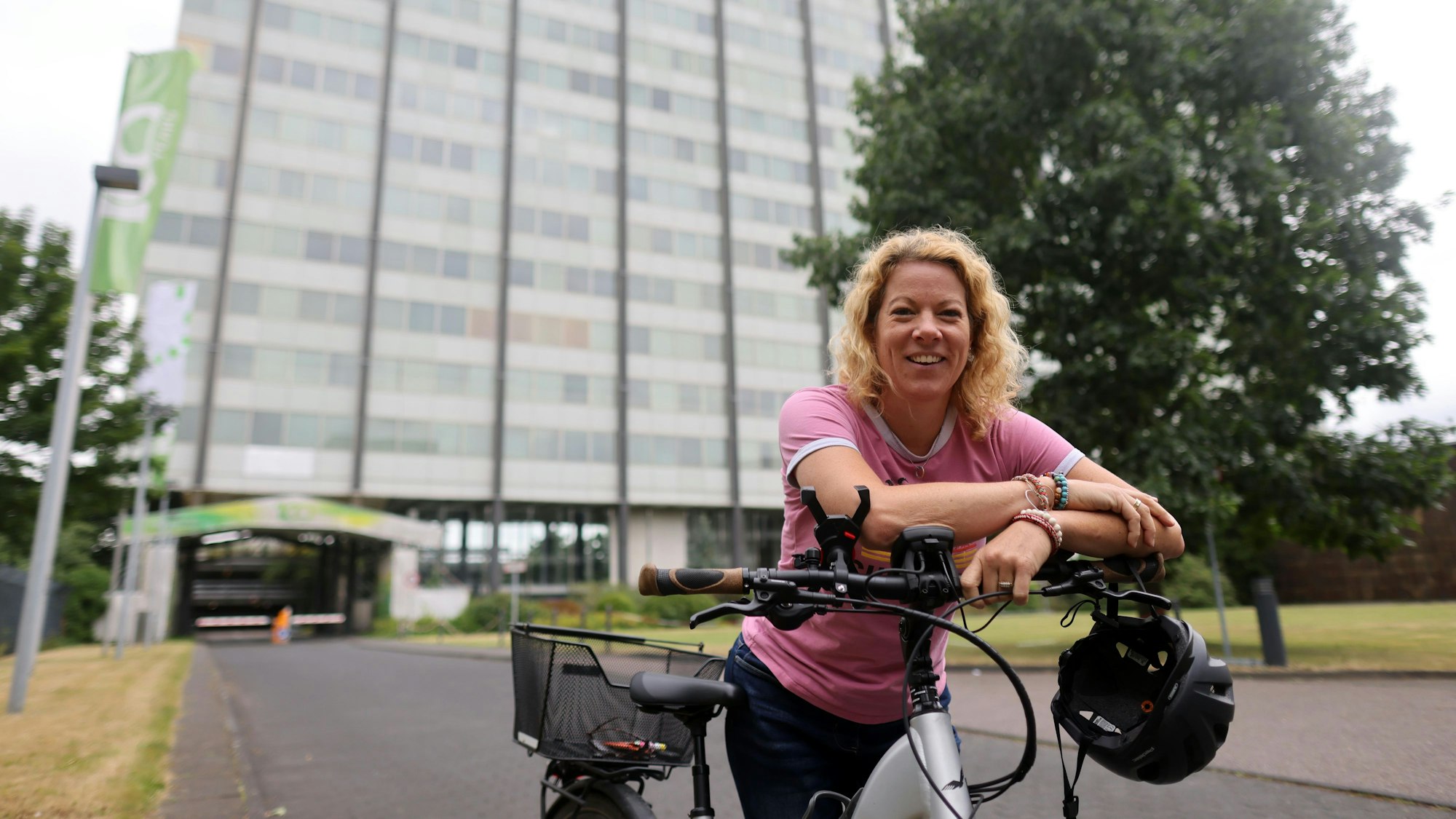 Melanie Bollhorst macht sich mittlerweile am liebsten mit dem E-Bike auf den Weg zum Messehochhaus. Doch das ist gar nicht so einfach.