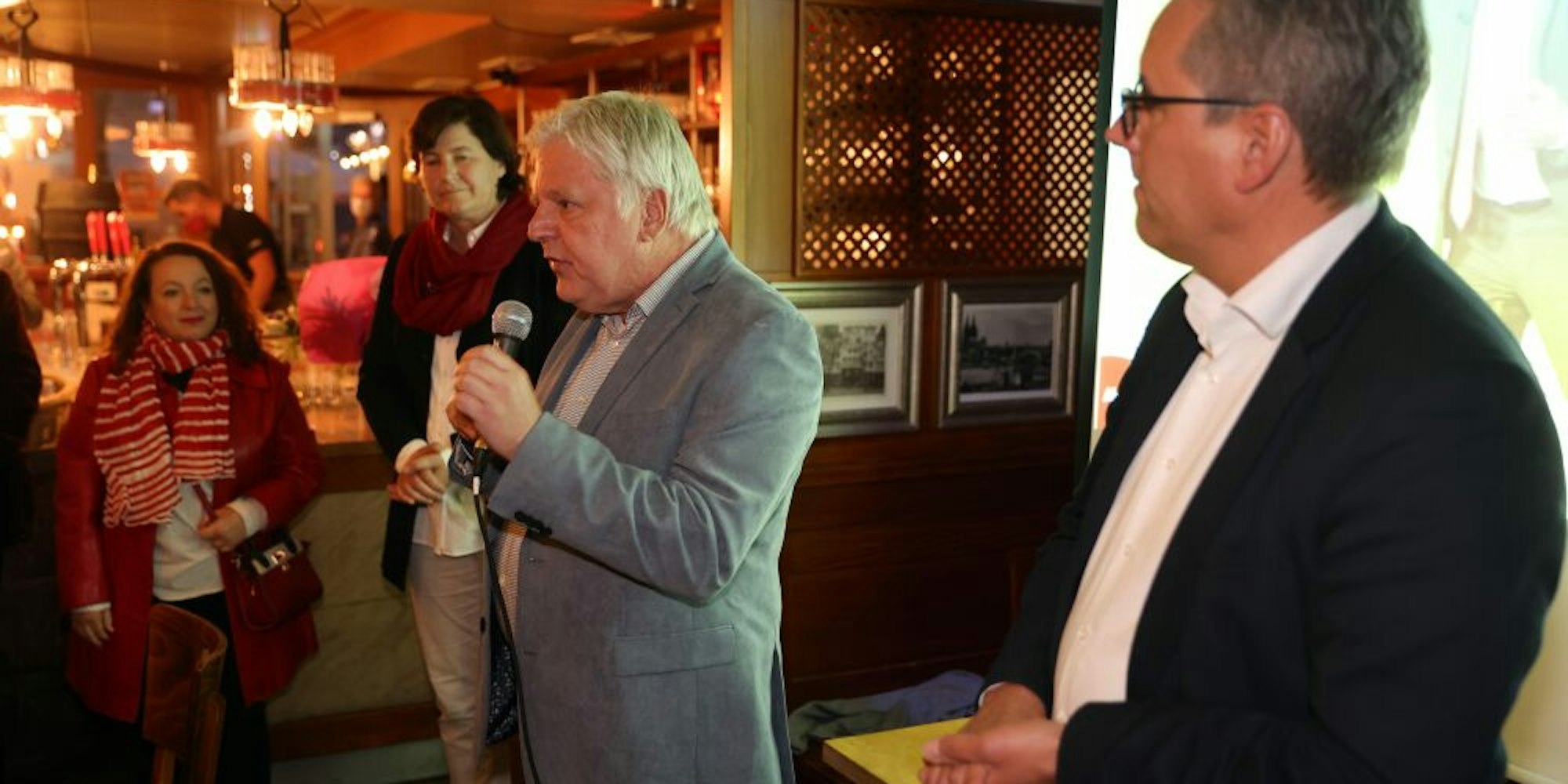 Andreas Kossiski (2.v.r.) kündigt nach der Niederlage am Wahlabend vor Ehefrau Marcella Quaglia (l.) und SPD-Chefin Christiane Jäger seine Kandidatur für den SPD-Fraktionsvorsitz an und überrascht damit nicht nur Fraktionschef Christian Joisten (r.).