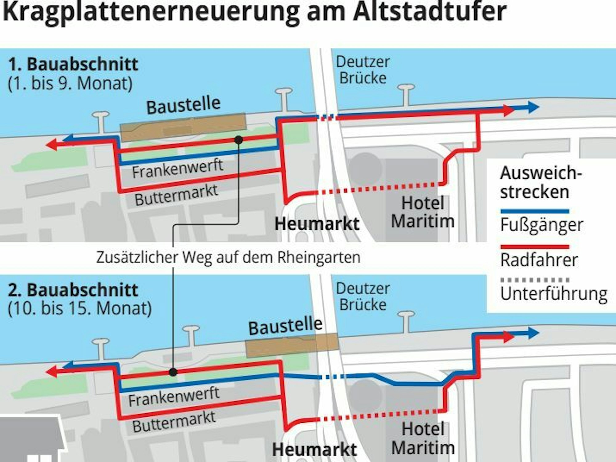 Als klar wurde, dass die Bauarbeiten den Rad- und Fußweg unter der Deutzer Brücke betreffen, ging die öffentliche Diskussion um eine Umleitung los. ADFC und die Bezirksvertretung Innenstadt machten, wie die Rundschau damals berichtete, sogar den Vorschlag, eine Seite des Rheinufertunnels als Röhre für die Radfahrer freizugeben. Das ließ die Stadt nicht zu. Die Entscheidung fiel auf eine Umleitung über die Gasse „Buttermarkt“, die in zweiter Reihe parallel zum Rhein verläuft. Dann können die Radfahrer während des ersten Bauabschnitts noch am Rhein unter der Brücke durchfahren oder den Tunnel am Maritimhotel nutzen. Im zweiten Abschnitt dient nur noch der Tunnel als Umleitung.