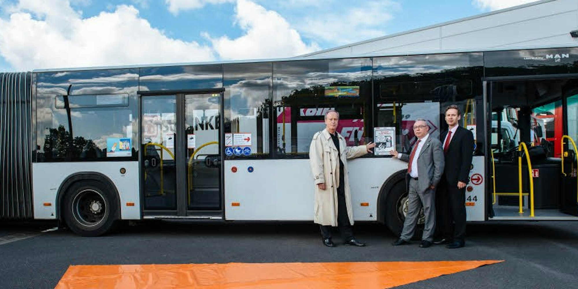 Günter Bäumerich (Verkehrswacht), Karl Schoeterler (KVB-Bereichsleiter Bus) und Volker Heinsch (KVB-Leiter Fahrbetrieb Bus) (v.l.) stellen die Aufkleber vor. (Foto: Belibasakis)