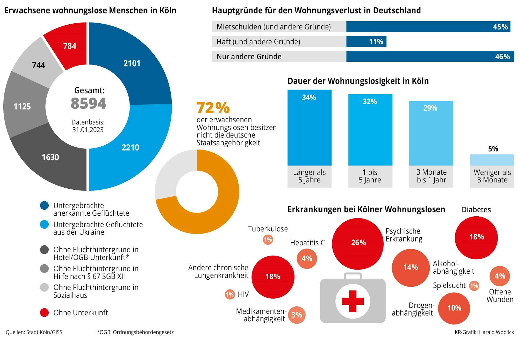 Anfang des Jahres 2023 hatten 11 740 Menschen in Köln keine Wohnung. Neben 8594 Erwachsenen waren zu diesem Zeitpunkt auch 3146 minderjährige Kinder und Jugendliche betroffen. Die Zahl der betroffenen Familien hat sich durch die Fluchtbewegungen in den Jahren 2015/16 und 2022 im Zuge des Krieges gegen die Ukraine deutlich erhöht. Der Anteil erwachsener Männer (4115) und Frauen (3690), die institutionell untergebracht sind, ist ungefähr gleich hoch. 784 Erwachsene nehmen ein Unterbringungsangebot nicht an, 397 von ihnen leben gänzlich auf der Straße, 387 in „verdeckter Wohnungslosigkeit“ vorübergehend bei Bekannten.