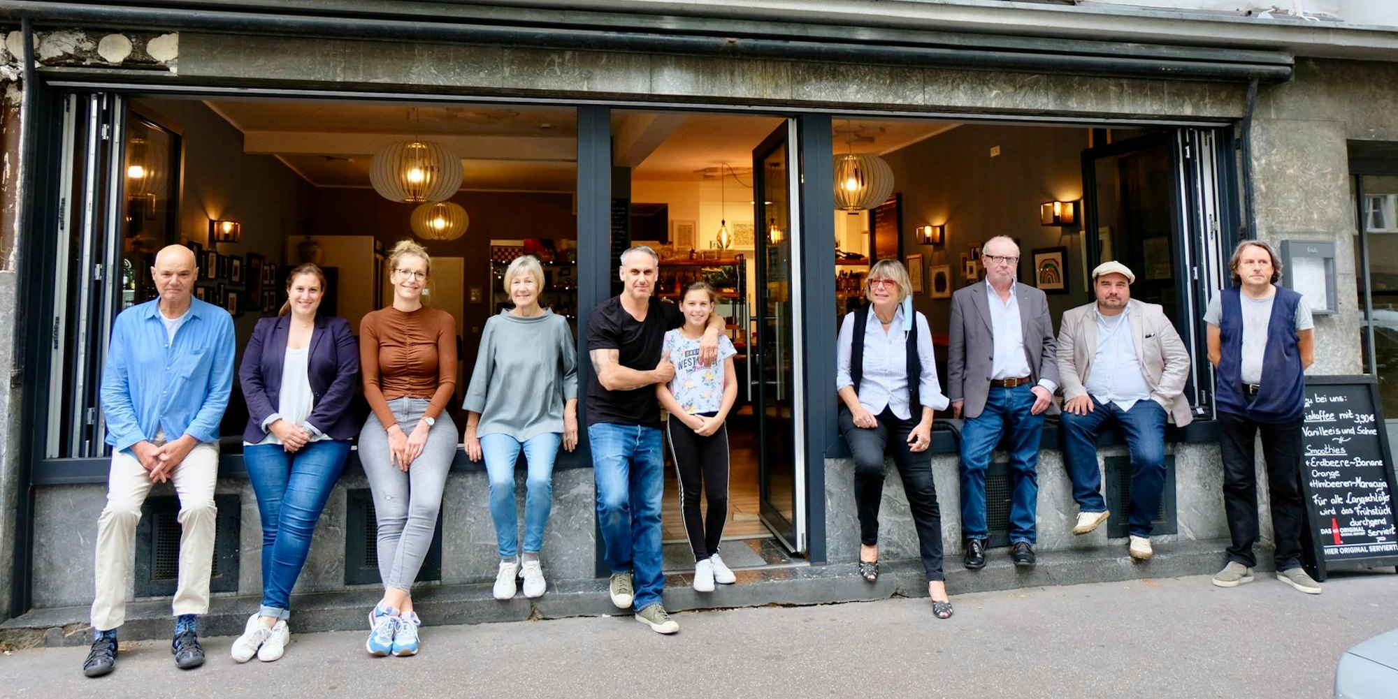 Marsel Alajbegovic (5.v.l.) mit seiner Tochter, Stammgästen und Bezirkspolitikern vor dem Café Laura