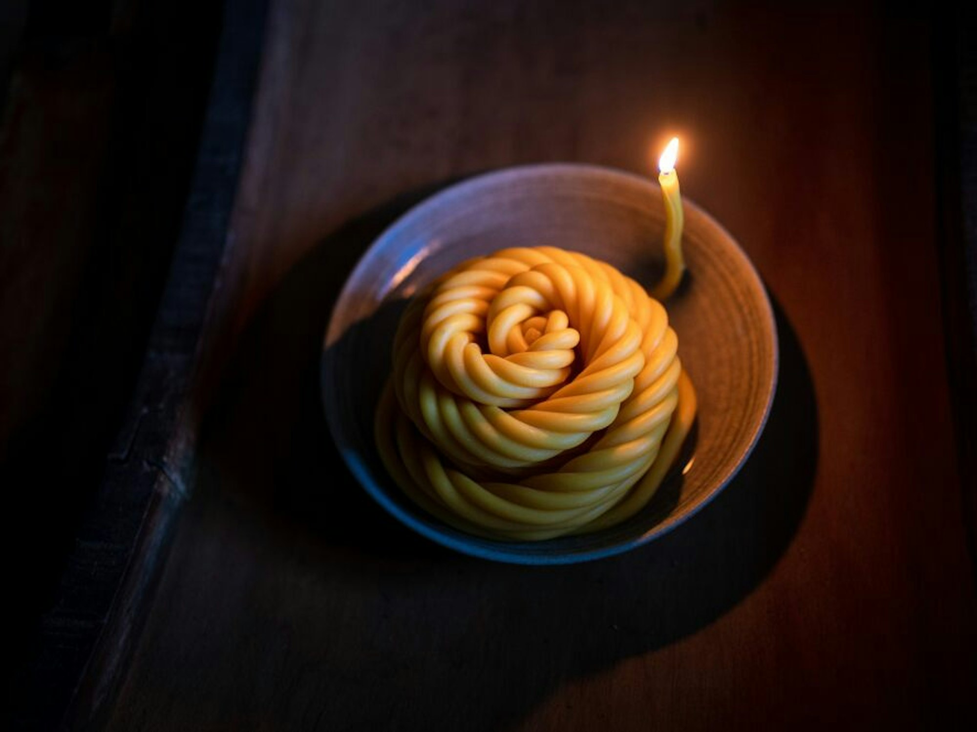 Um das Licht von Wachsstock-Kerzen sicher zu genießen, empfiehlt die Werkstatt, sie in Keramikschalen mit ein wenig Wasser auf dem Boden zu setzen.