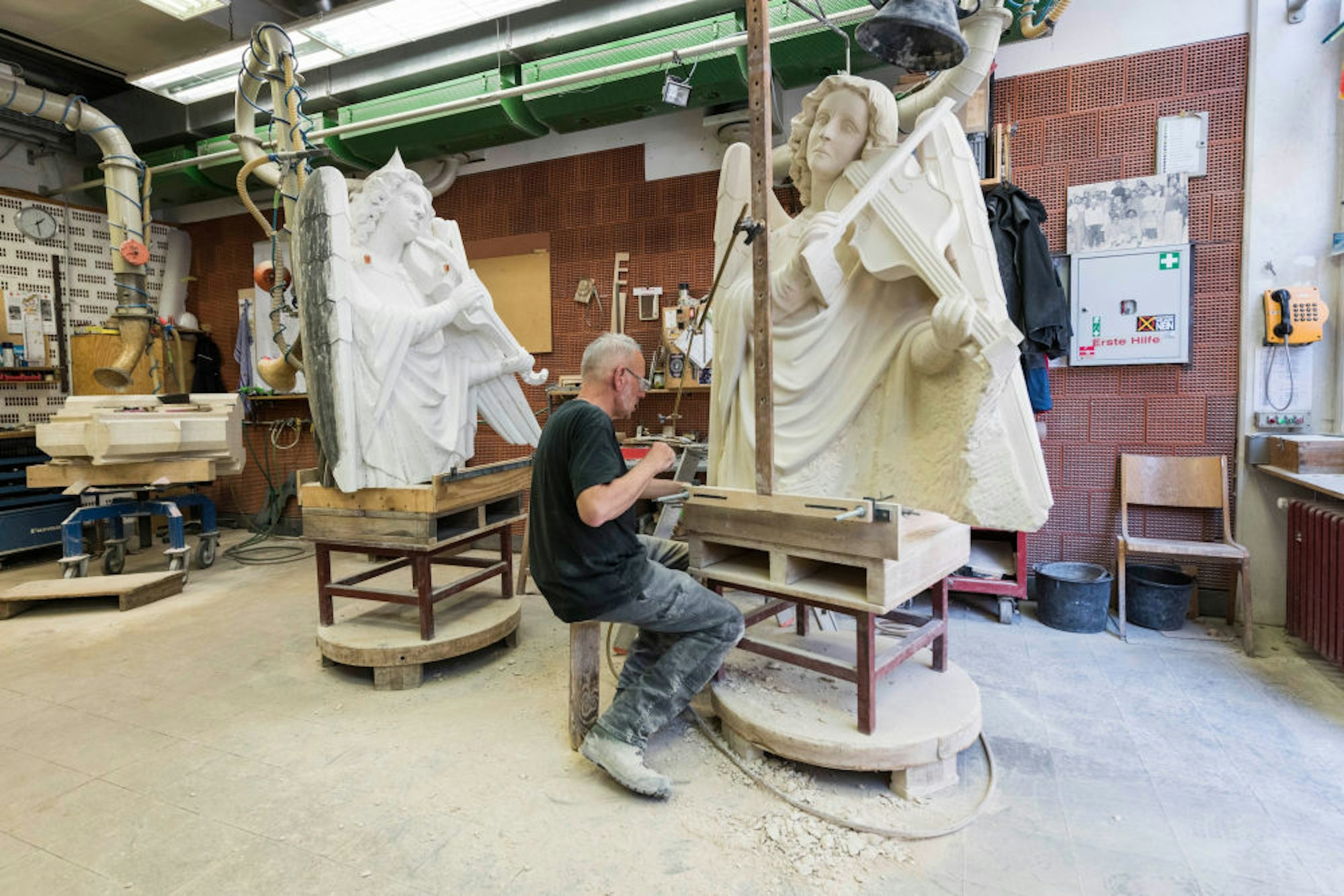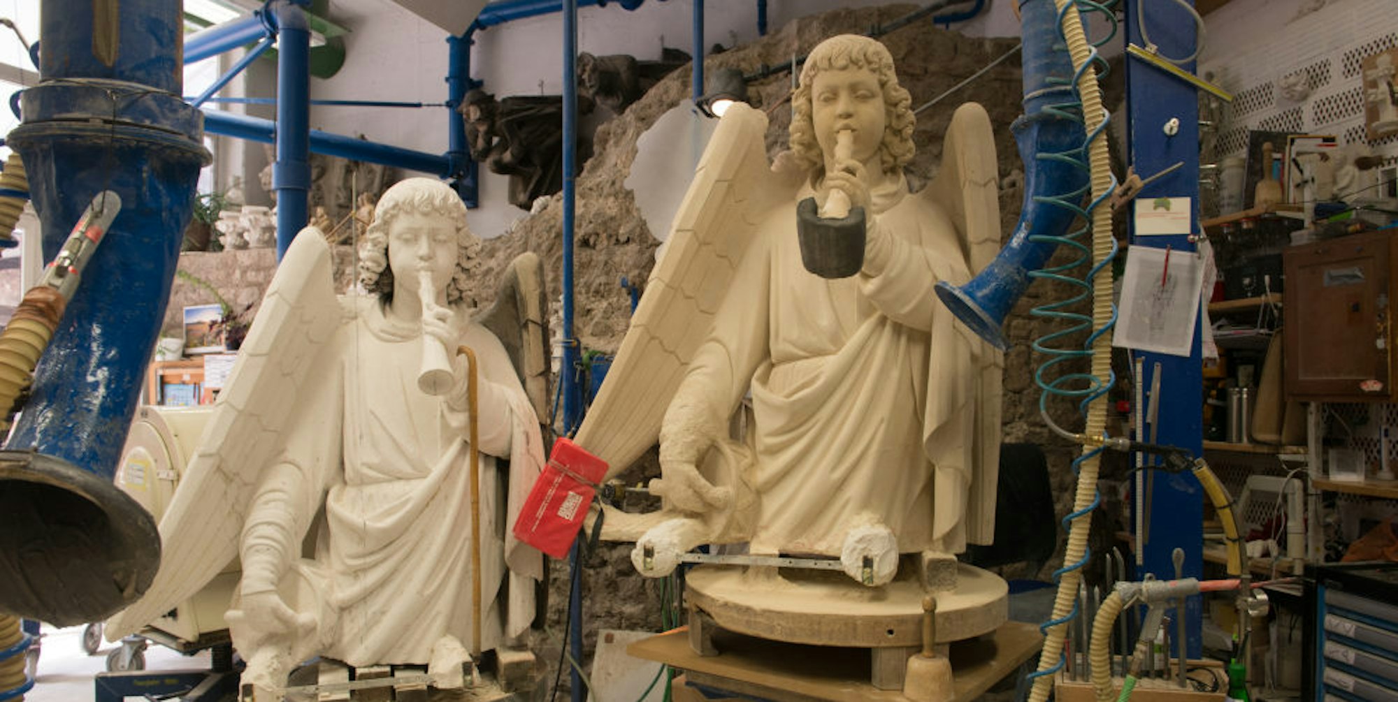 Die jeweils 1500 Kilo schweren Engel wurden in der Dombauhütte zunächst mit Gips aufmodelliert. Nicht nur Arme und Hände fehlten. Sie hatten sprichwörtlich Federn gelassen. Auch die Flügel waren weg. Von den Instrumenten hatten Wind und Wetter nur wenig übergelassen. Nicht alles, was fehlte, war auf alten Entwurfszeichnungen dokumentiert. Die „Meister“ der Dombauhütte mussten bei der Rekonstruktion „frei interpretieren“.