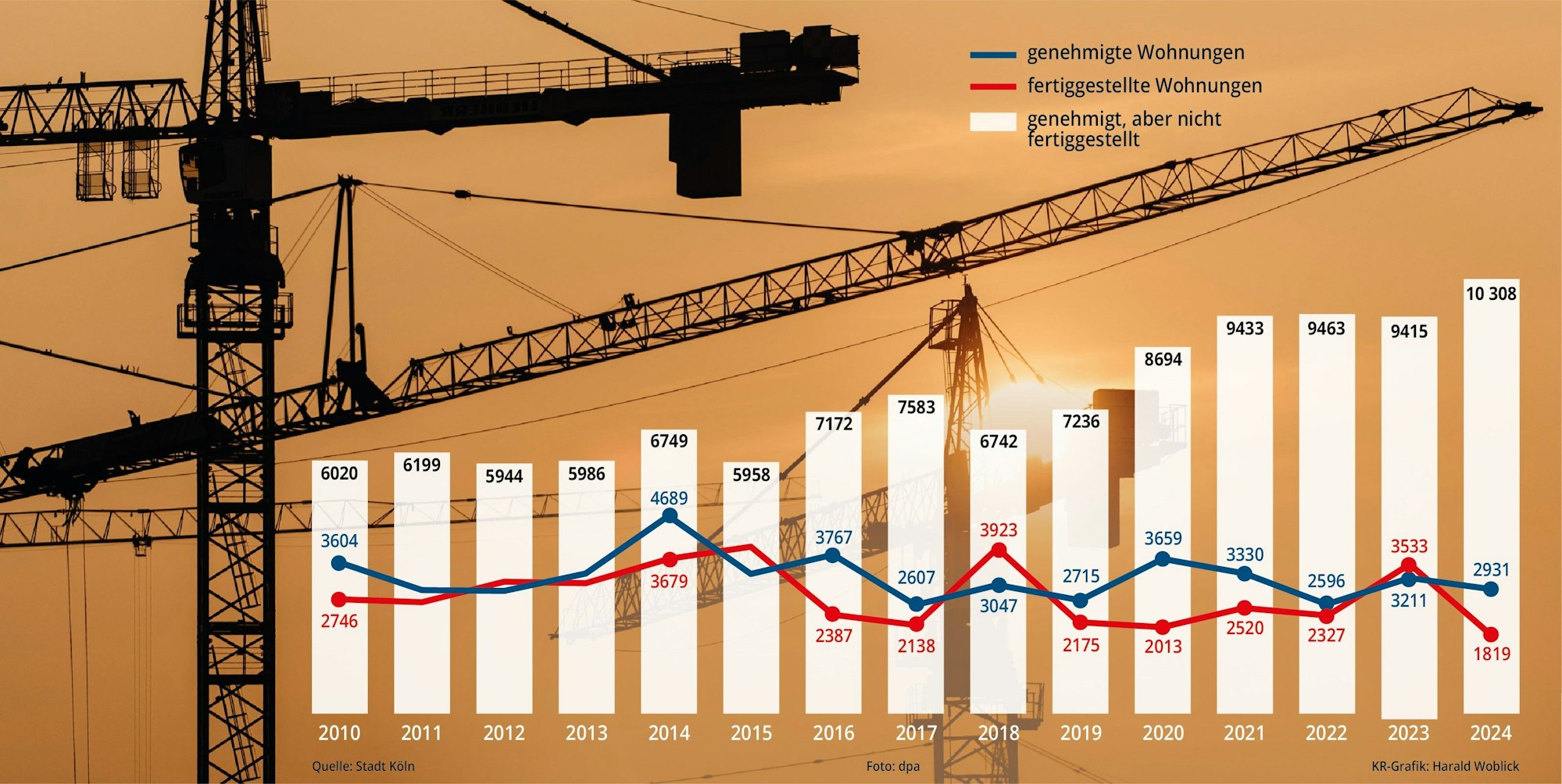 2024 waren in Köln nur 1819 Wohnungen fertiggestellt worden (siehe Grafik), die Zahlen für 2025 liegen noch nicht vor. Damit hinke die Stadt meilenweit hinter dem Bedarf her, unterstreicht der Geschäftsführer des Mietervereins, Hans Jörg Depel. Köln sei eine wachsende Stadt und benötige laut seriöser Studien 70.000 neue Wohnungen bis 2040. Doch Köln verliere immer mehr Sozialwohnungen und bei den größeren Bauprojekten sei kein Fortschritt zu verzeichnen. Über den geplanten neuen Stadtteil Kreuzfeld rede man schon seit den 1960er-Jahren.