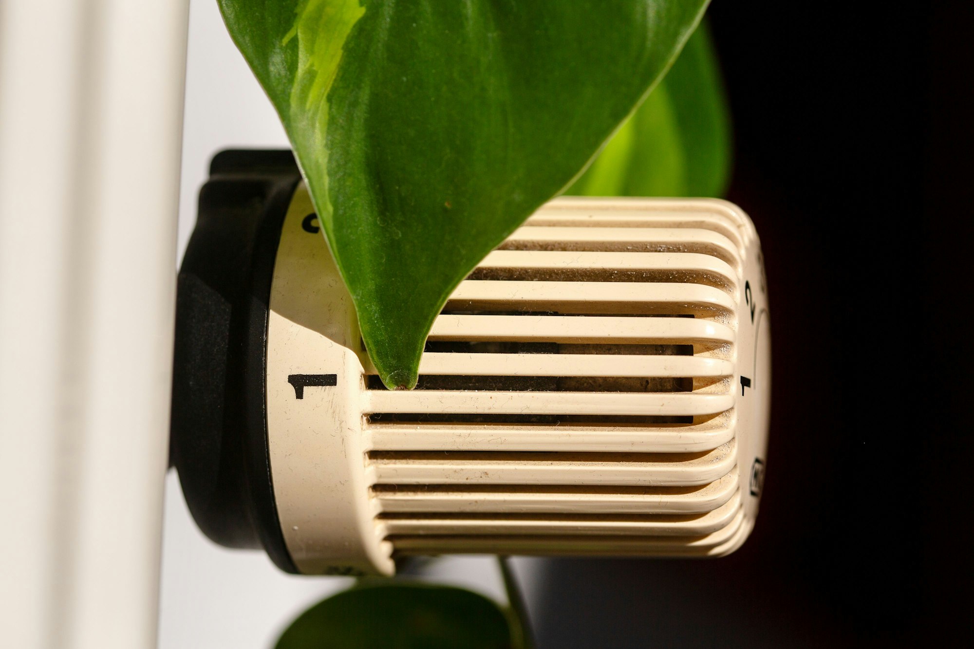 Ein Heizkörperthermostat mit einer Pflanze daran, die von Sonnenlicht angestrahlt wird.