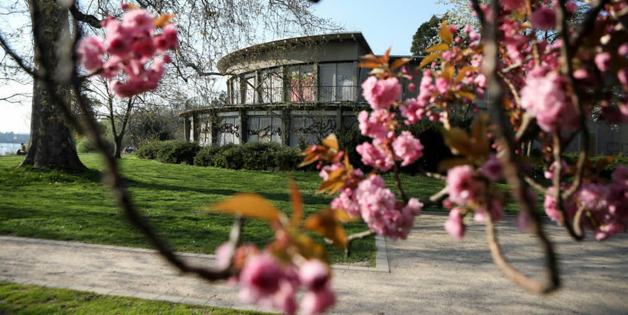 Köln-Stammheim – Das Grün des Rasens ist satt, die Japanische Kirsche blüht und die Sonne taucht den Stammheimer Schlosspark in ein besonderes Licht. Das lockt Erholungssuchende. Zu Fuß, mit dem Rad, Jung und Alt. Es geht vorbei an Skulpturen wie Steff Adams „Emily“, die auf einer Schaukel an einem Baum hin und her schwingt, oder an der überdimensionalen, orangefarbenen Tierfalle von Guido Weggenmann oder an Gilbert Flöcks „Hundemeute“ aus Stahl.