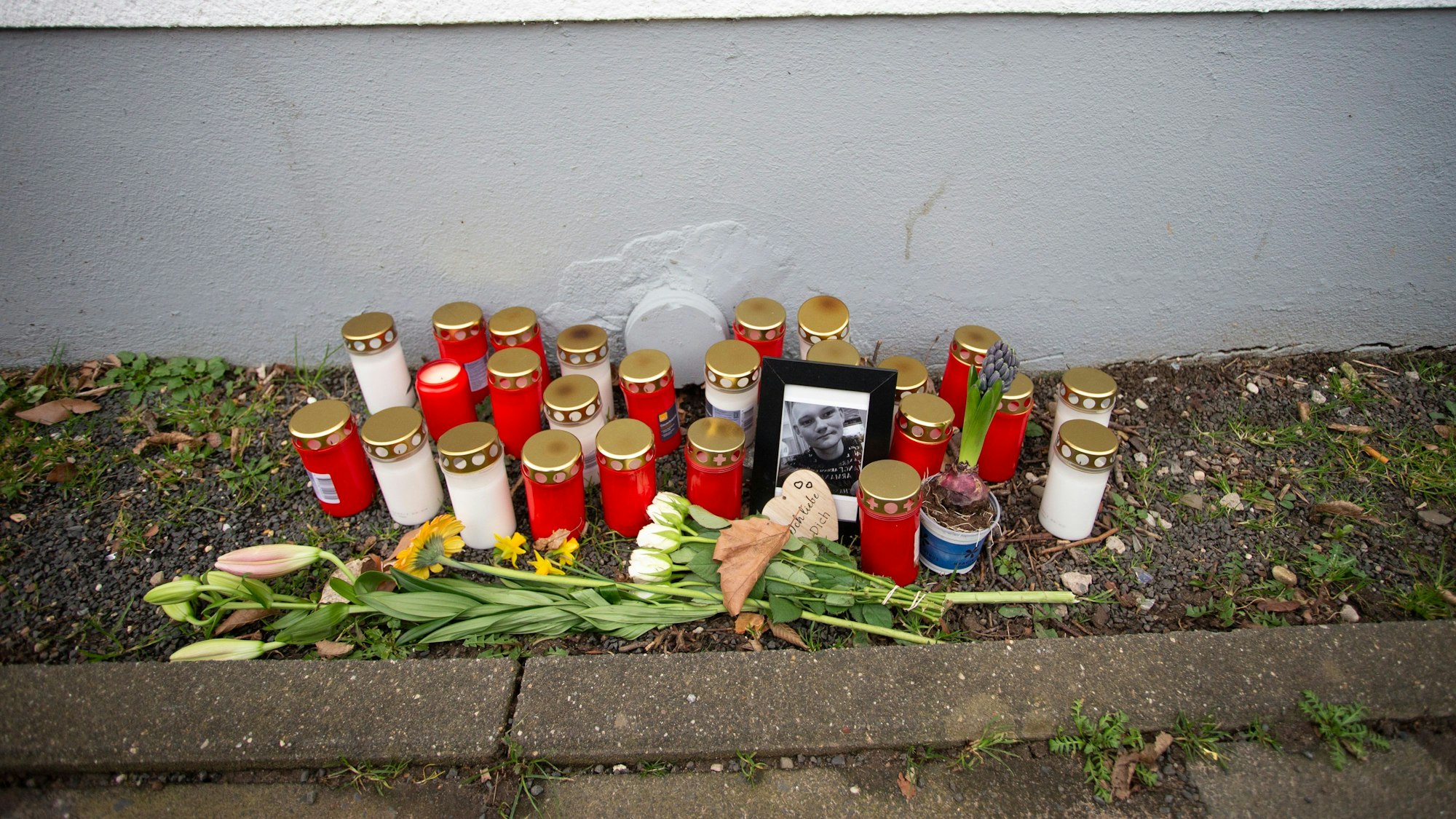 Bekannte und Freunde des Opfers haben Kerzen und Blumen in der Nähe des Tatorts abgelegt. Ein 23-Jähriger ist am Sonntagabend nach Angriffen in Köln Stammheim tödlich verletzt worden. . © Thomas Banneyer