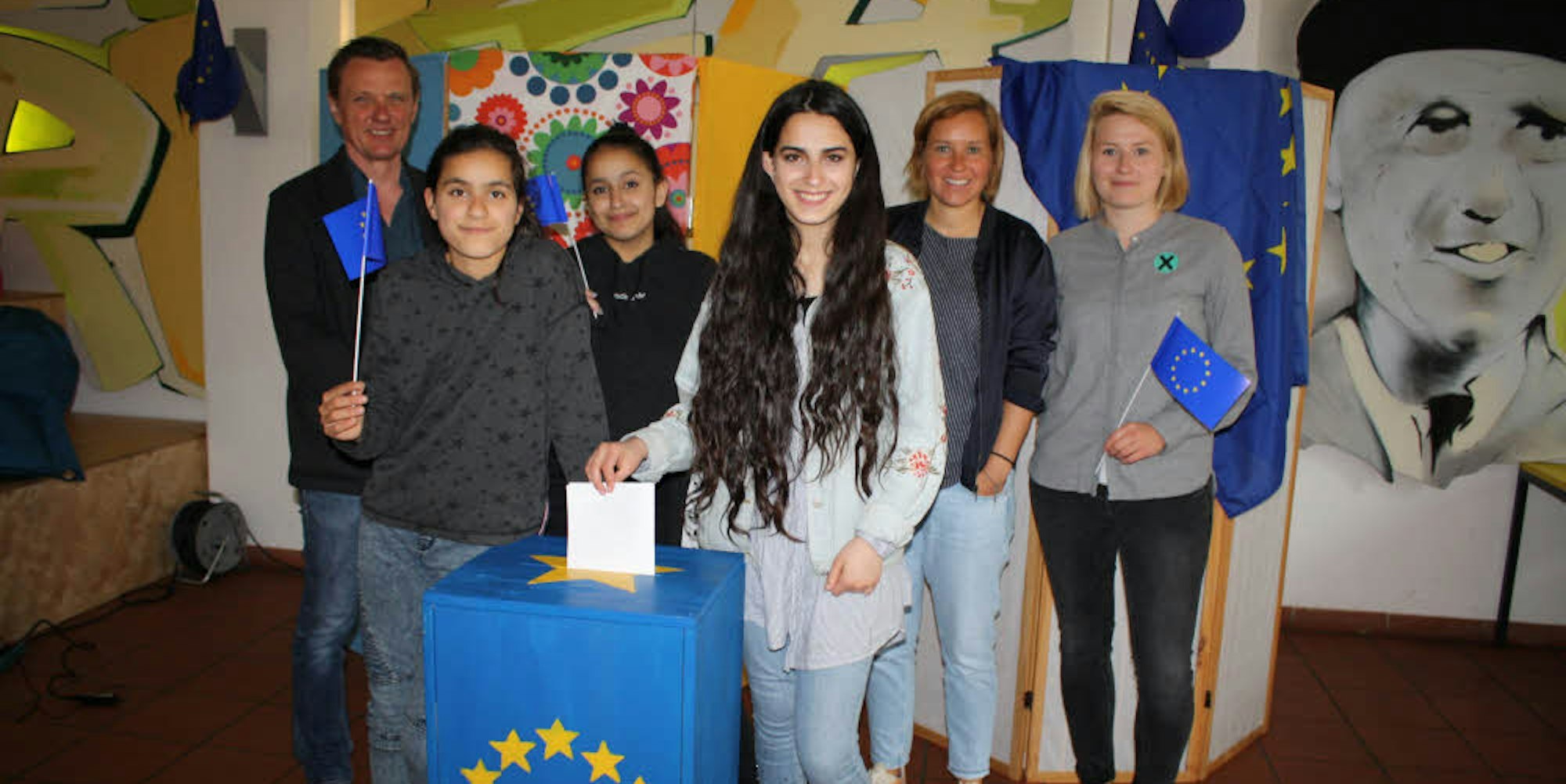 „Ich verbinde mit Europa vor allem Frieden“, sagt die 15-jährige Media Elias, die den Unterschied zu einem kriegsgeplagten Land selbst erfahren hat. Vor drei Jahren kam sie aus dem Irak nach Deutschland. „Ich finde den Einsatz für mehr Naturschutz aber auch sehr wichtig“, sagt die junge Frau, die gemeinsam mit ihren Mitstreiterinnen Aya Ahmad (13) und Ceyda Atac (13) den örtlichen Wahlausschuss stellt und über den ordnungsgemäßen Ablauf der Stimmabgabe wacht.