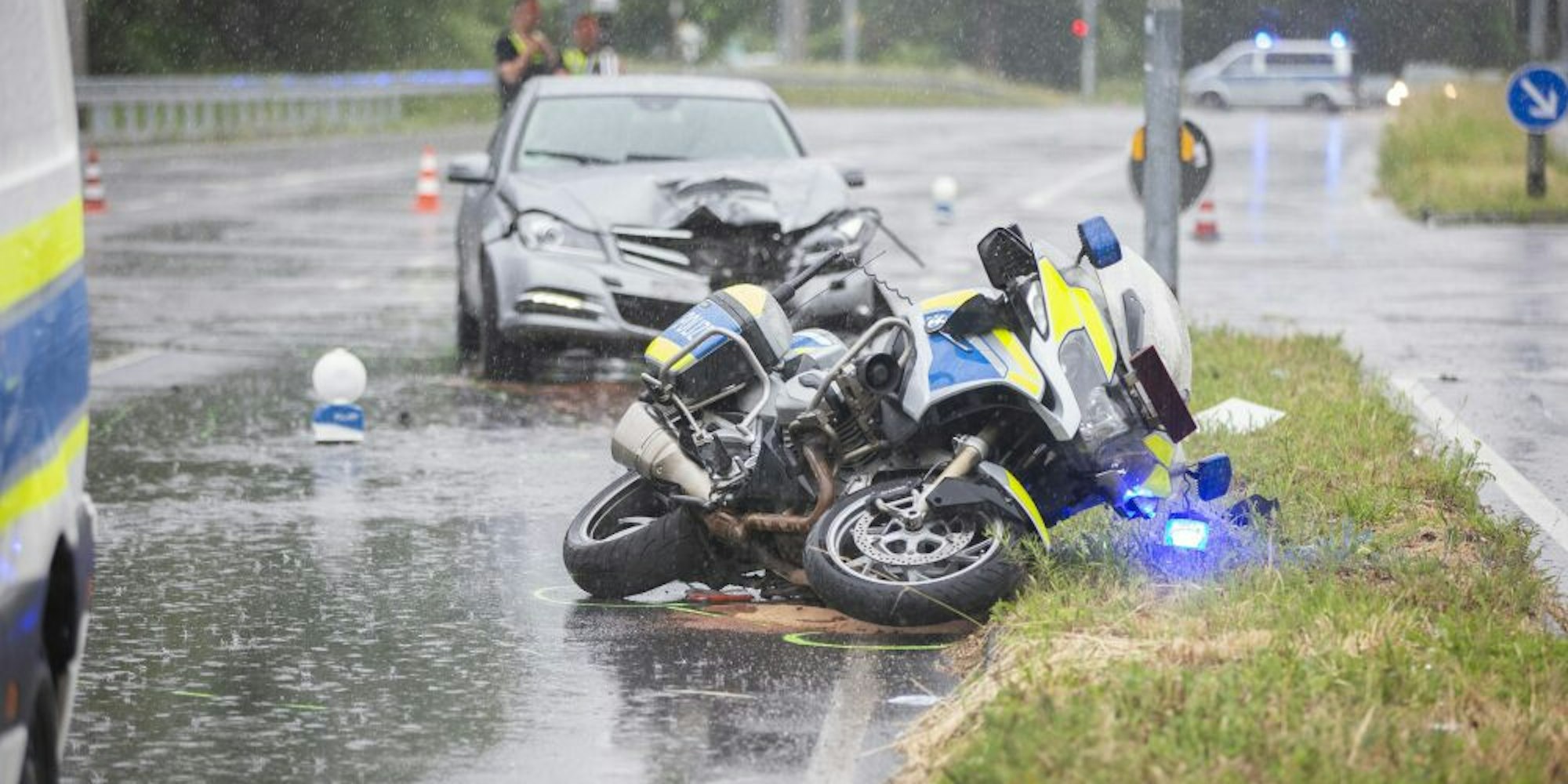 Ein Motorrad der Polizei liegt schwer beschädigt auf einem Grünstreifen, wenige Meter dahin steht ein Mercedes mit erheblich demoliertem Frontbereich. Offensichtlich mit großer Wucht sind beide Verkehrsteilnehmer kollidiert.