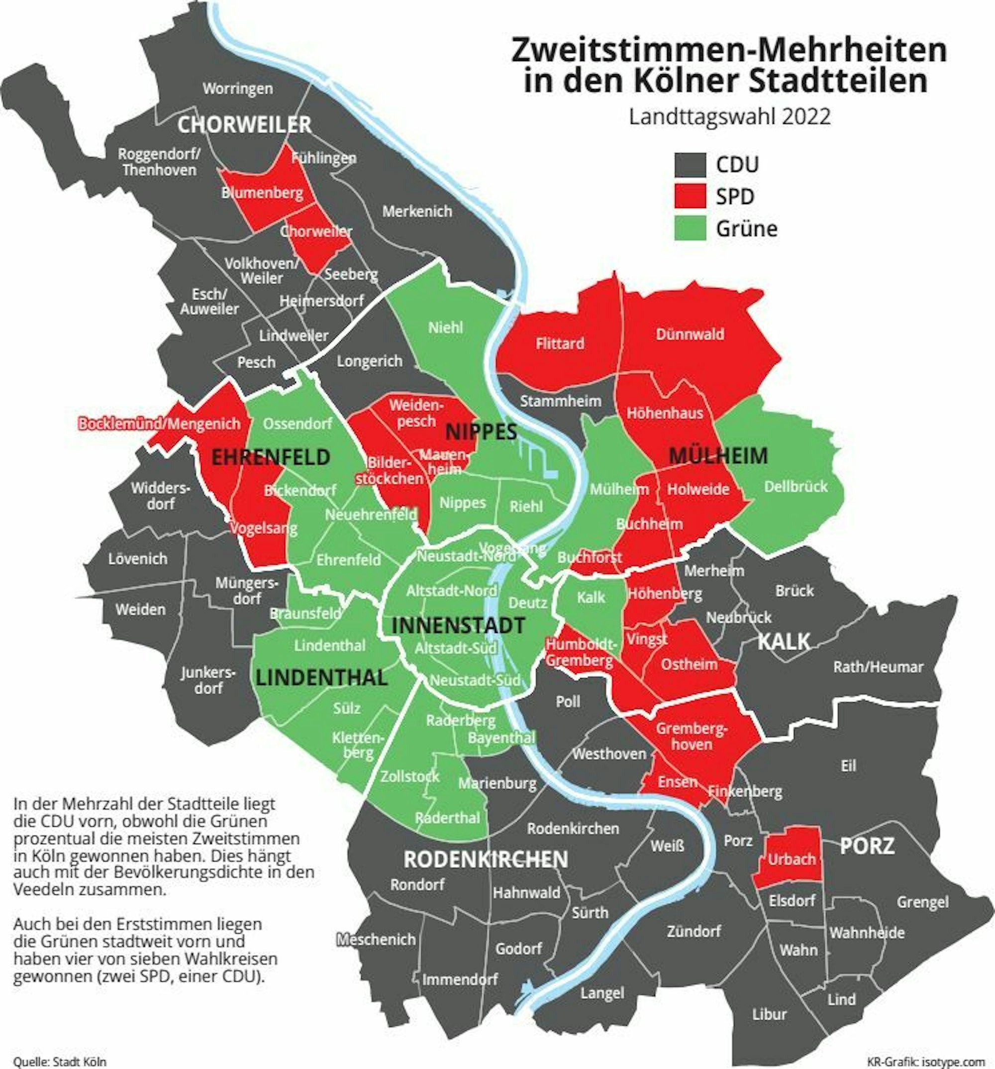 Bei dem ersten Blick auf die Zweitstimmenverteilung in den Stadtteilen kann ein falscher Eindruck entstehen. Beispielsweise in Chorweiler. Der Wahlbezirk ging an die SPD, dabei sieht es bei der Zweitstimmenverteilung in den Veedeln so aus, als habe die CDU die Nase vorne.